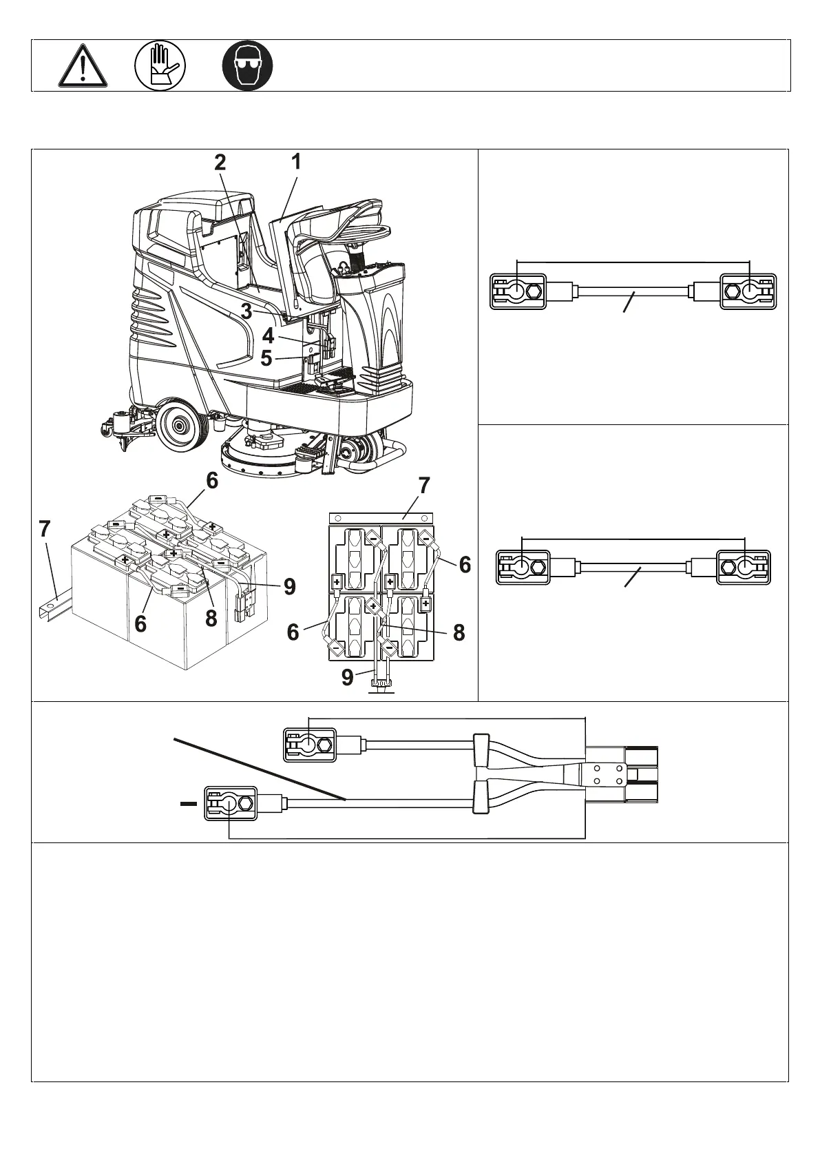 Use the cables (pos. 6-8) provided with the machine and connect the batteries, as shown the in the figure;