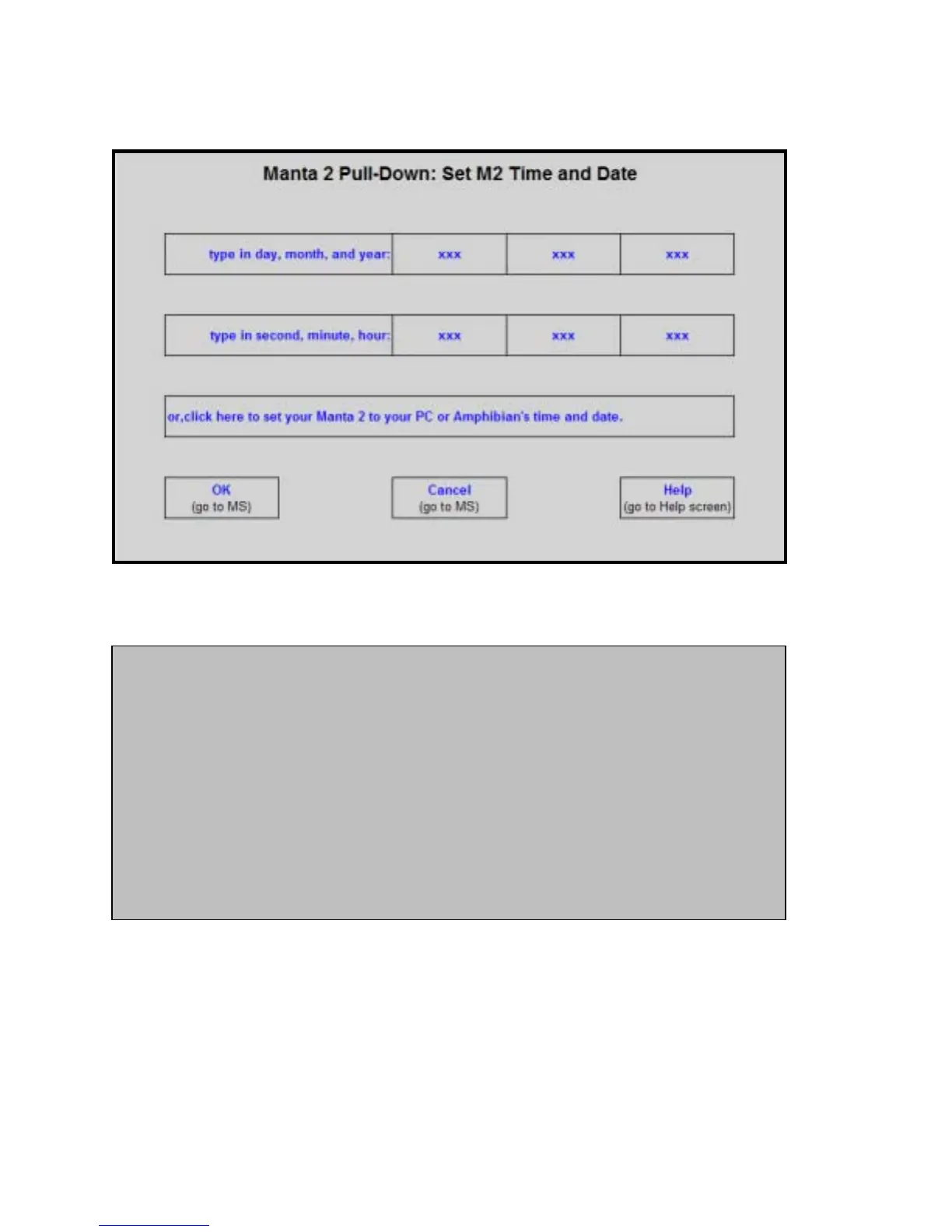 This screen shows you the Manta 2’s opinion on time and date. If you wish to change any of those