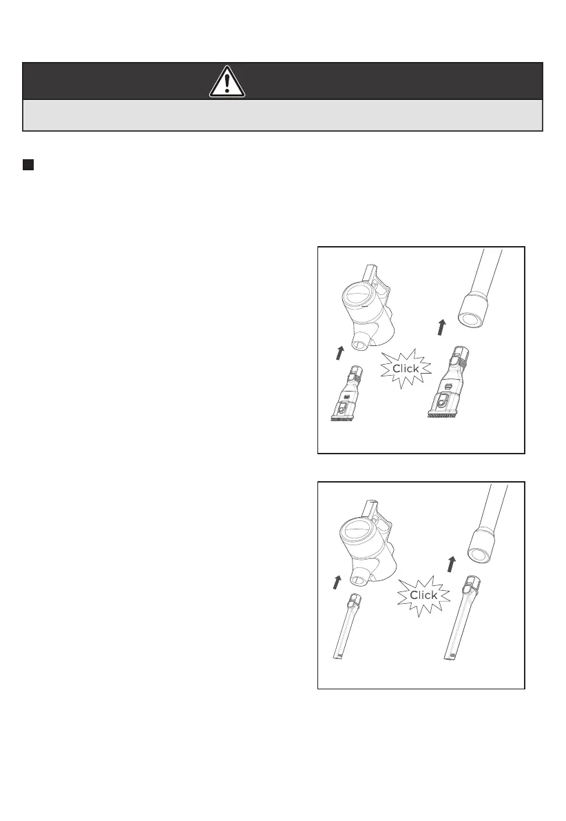 Moving parts! Always turn o hand vacuum before attaching accessories.