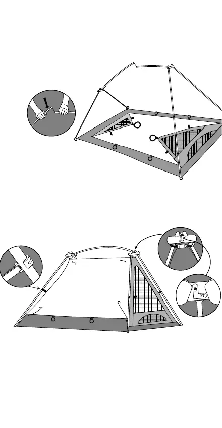 peaks of the tent, over the junction tubes. Snap tent clips to the poles.
