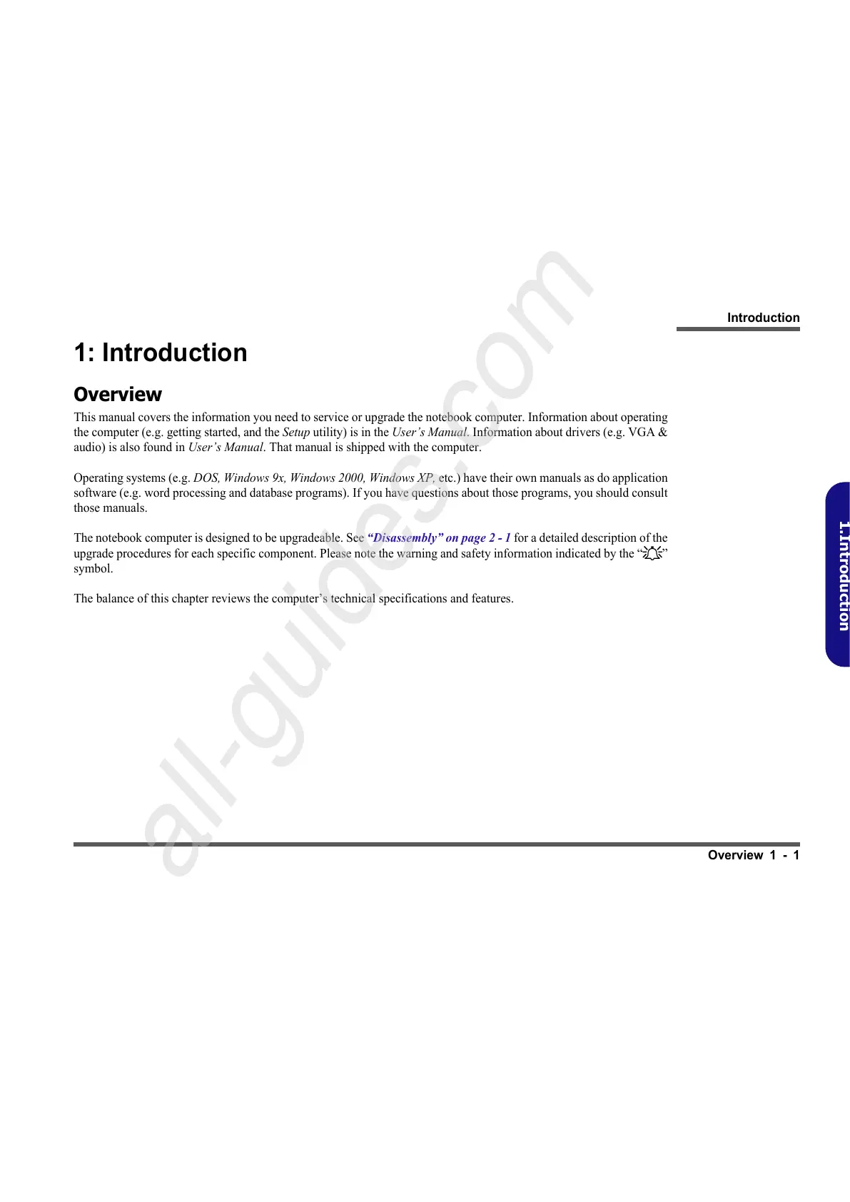 The notebook computer is designed to be upgradeable. See “Disassembly” on page 2 - 1 for a detailed description of the