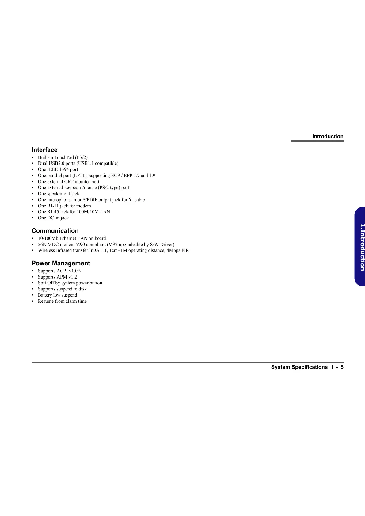 System Specifications 1 - 5