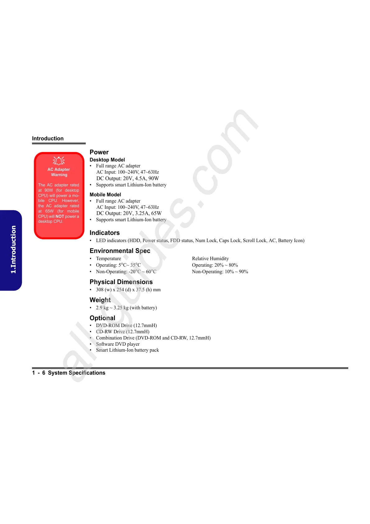 1 - 6 System Specifications