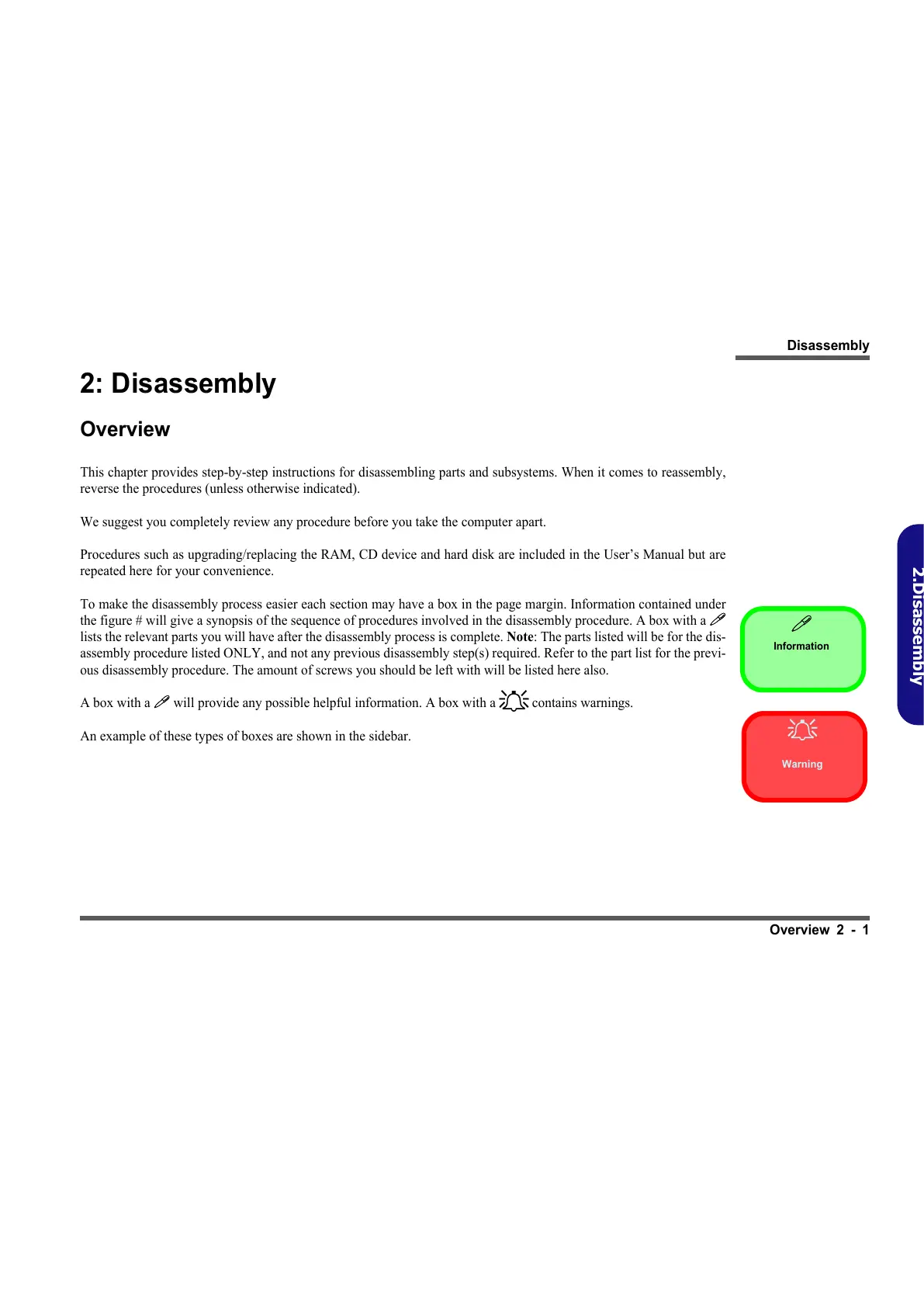 To make the disassembly process easier each section may have a box in the page margin. Information contained under