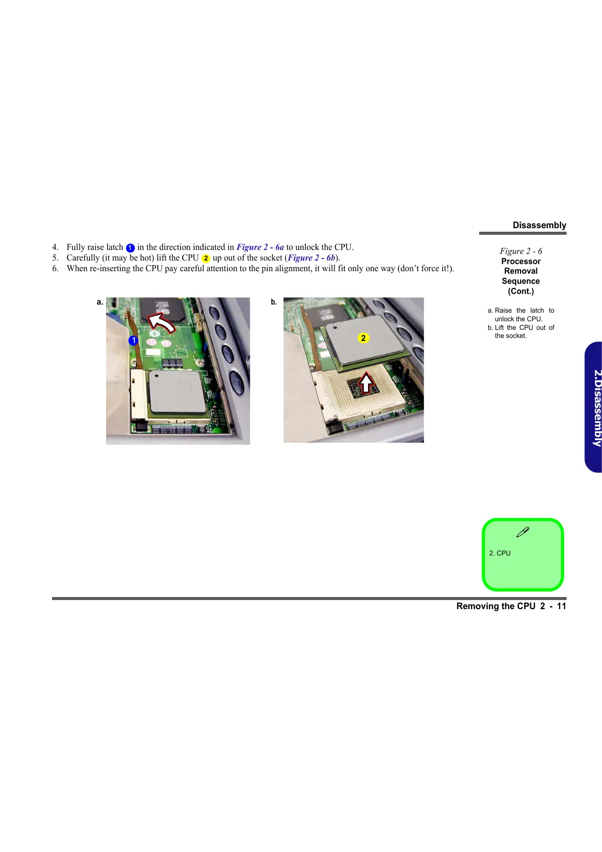 4. Fully raise latch in the direction indicated in Figure 2 - 6a to unlock the CPU.