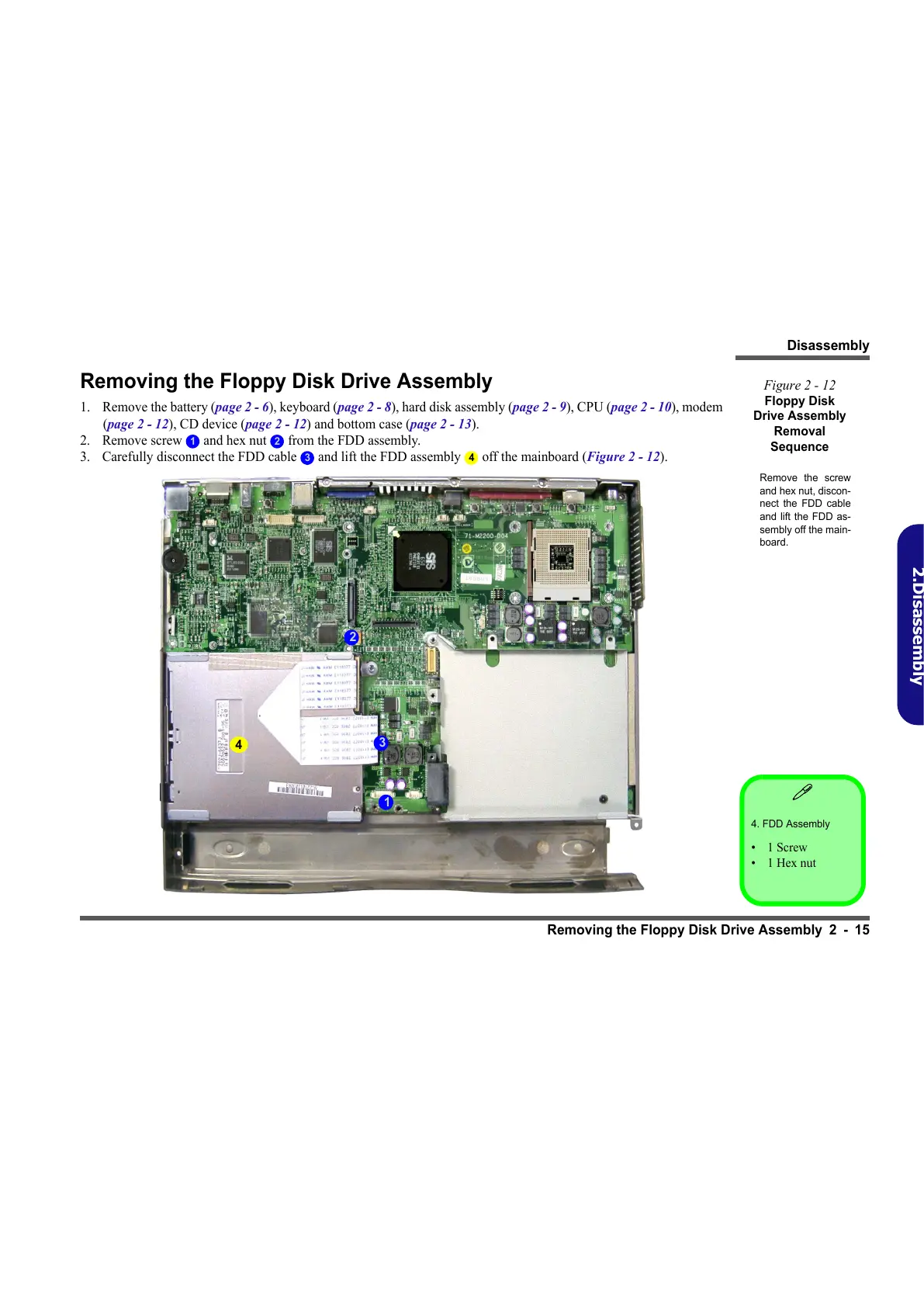 2. Remove screw and hex nut from the FDD assembly.