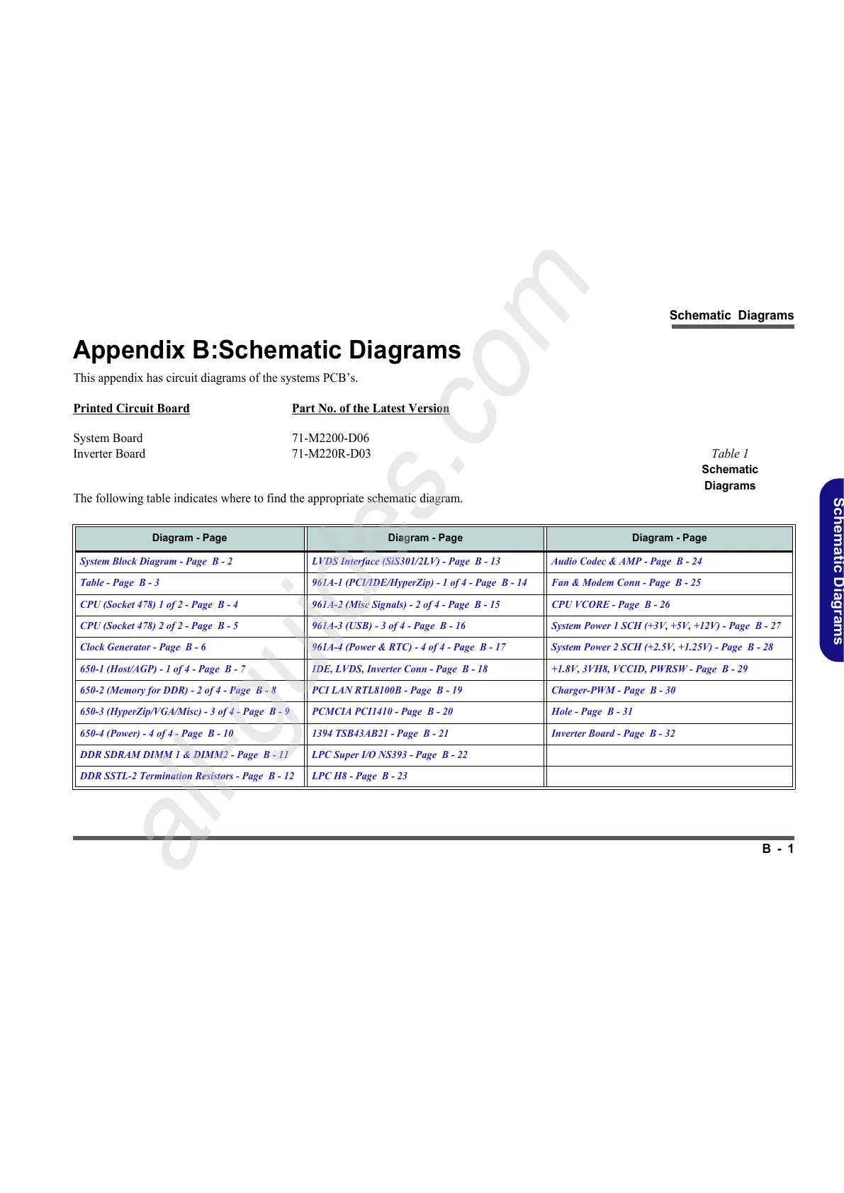 Table - Page B - 3 961A-1 (PCI/IDE/HyperZip) - 1 of 4 - Page B - 14 Fan & Modem Conn - Page B - 25