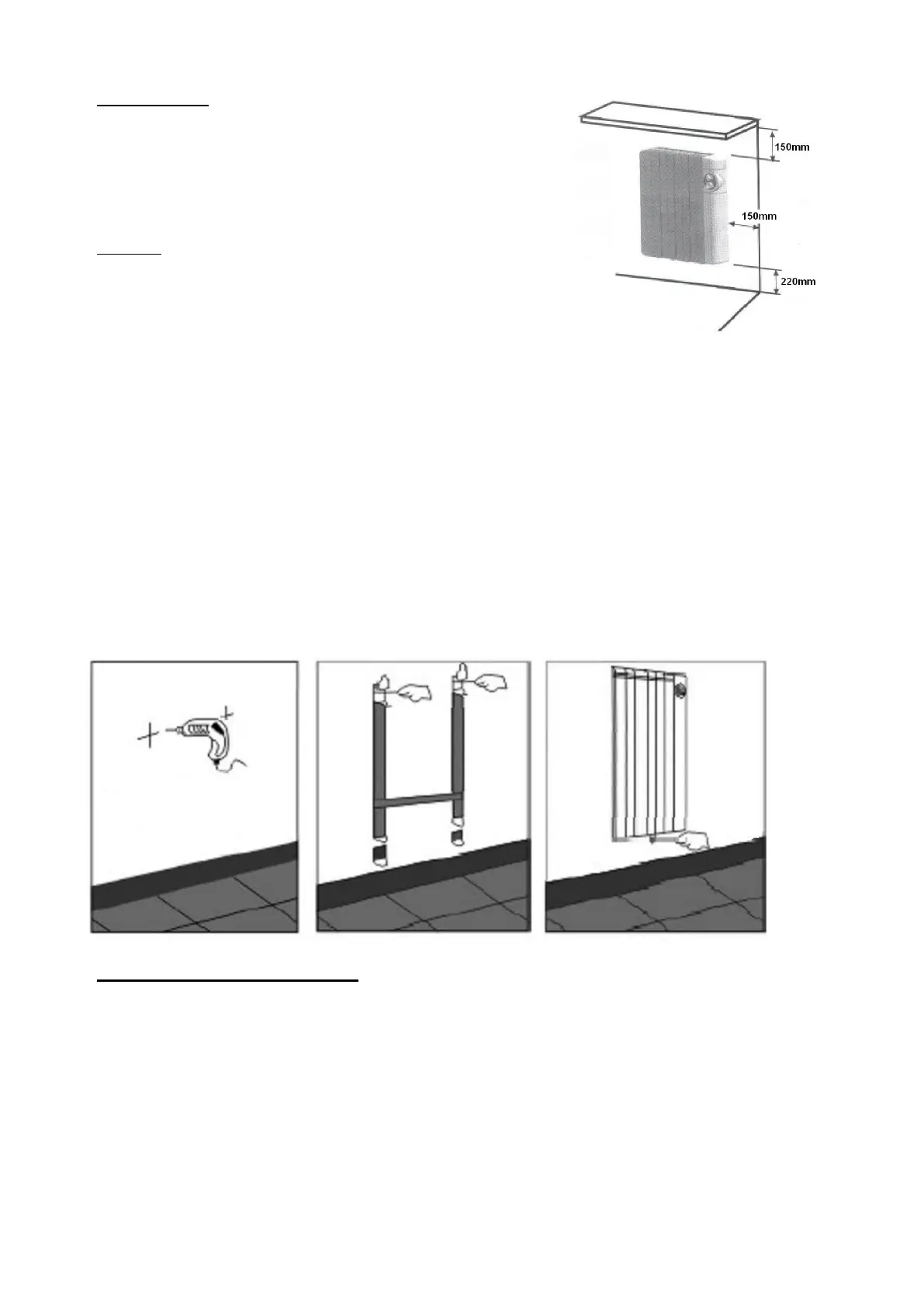 Der Heizkörper muss mindestens 150 mm von Gegenständen,