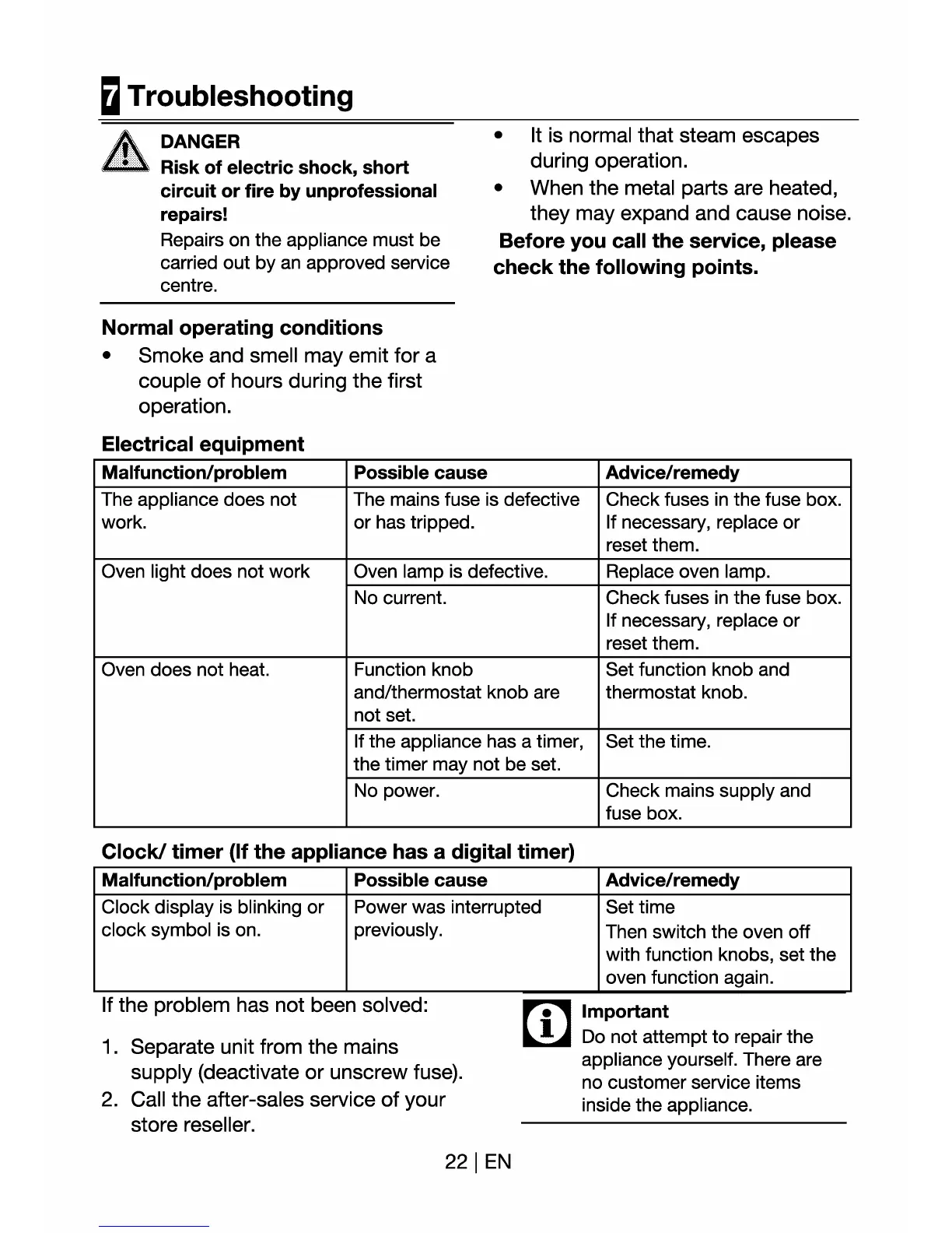 Euromaid BS6 - Oven Troubleshooting Guide; Normal Operating Conditions; Electrical Equipment Issues; Clock;Timer Issues