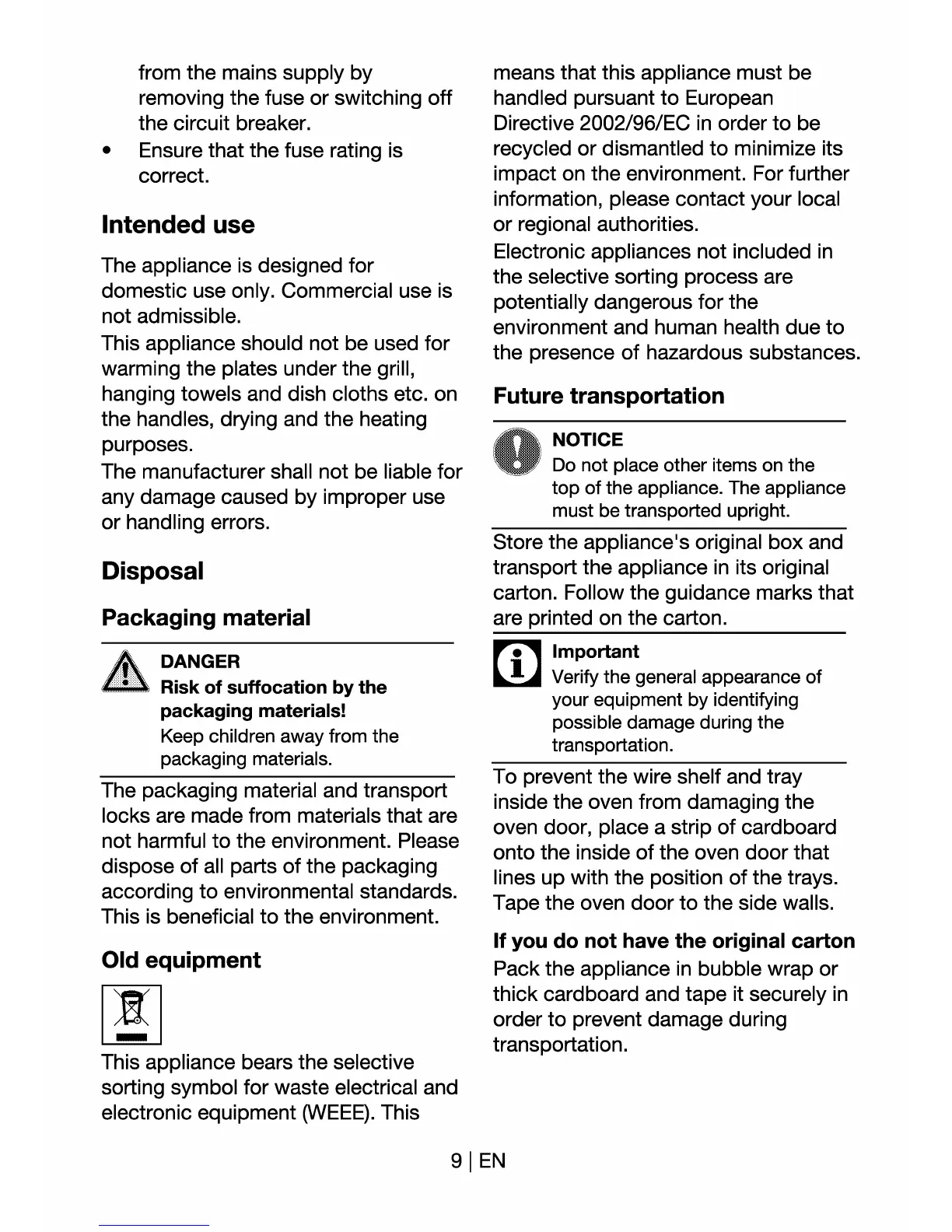 Euromaid BS6 - Appliance Intended Use; Appliance Disposal Information; Packaging Material Disposal; Old Equipment Disposal (WEEE)