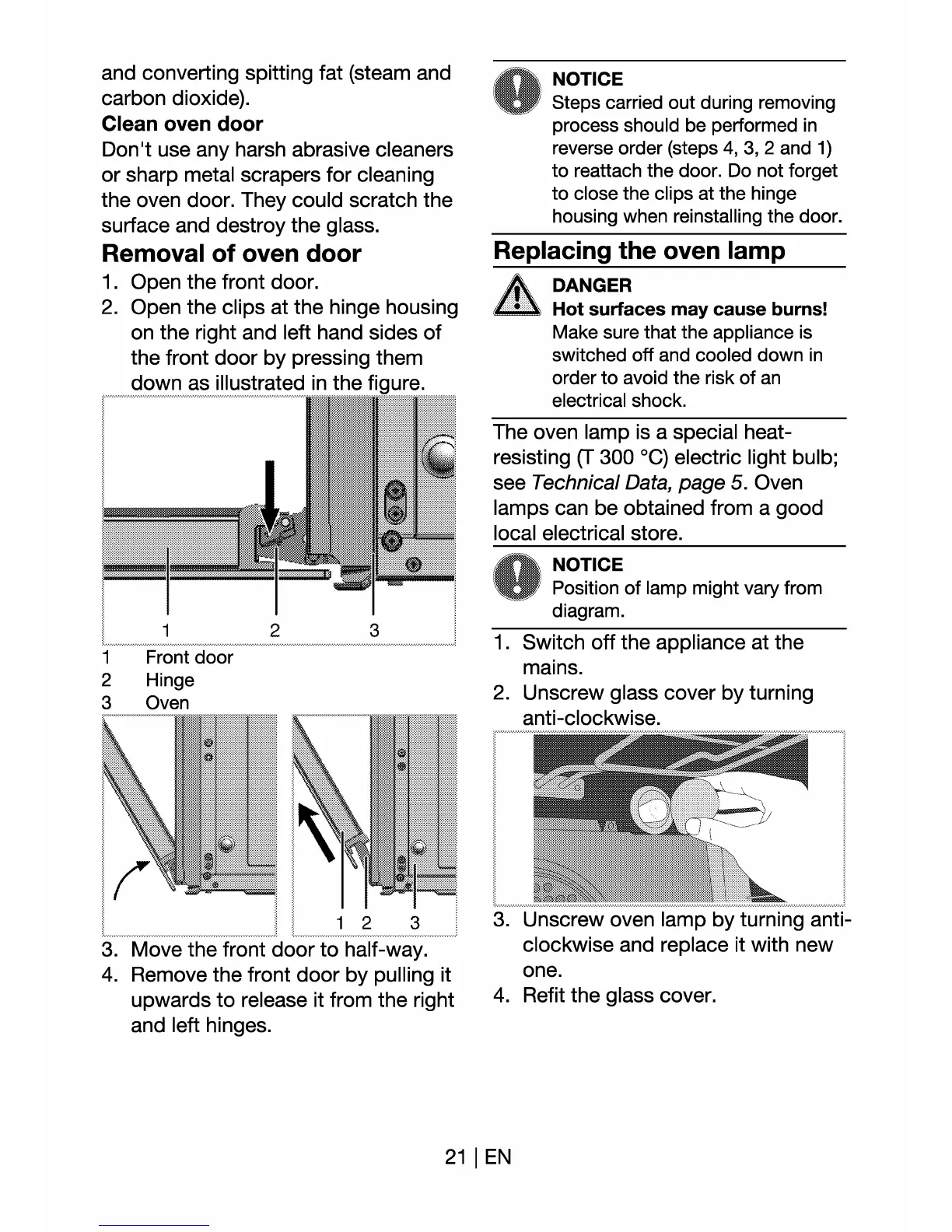 Euromaid BS8 - Clean Oven Door; Removal of Oven Door; Replacing the Oven Lamp