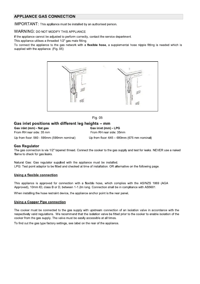 Euromaid EDF90S - Appliance Gas Connection; Gas Inlet Positions with Different Leg Heights; Gas Regulator; Using a Flexible Connection;Copper Pipe Connection