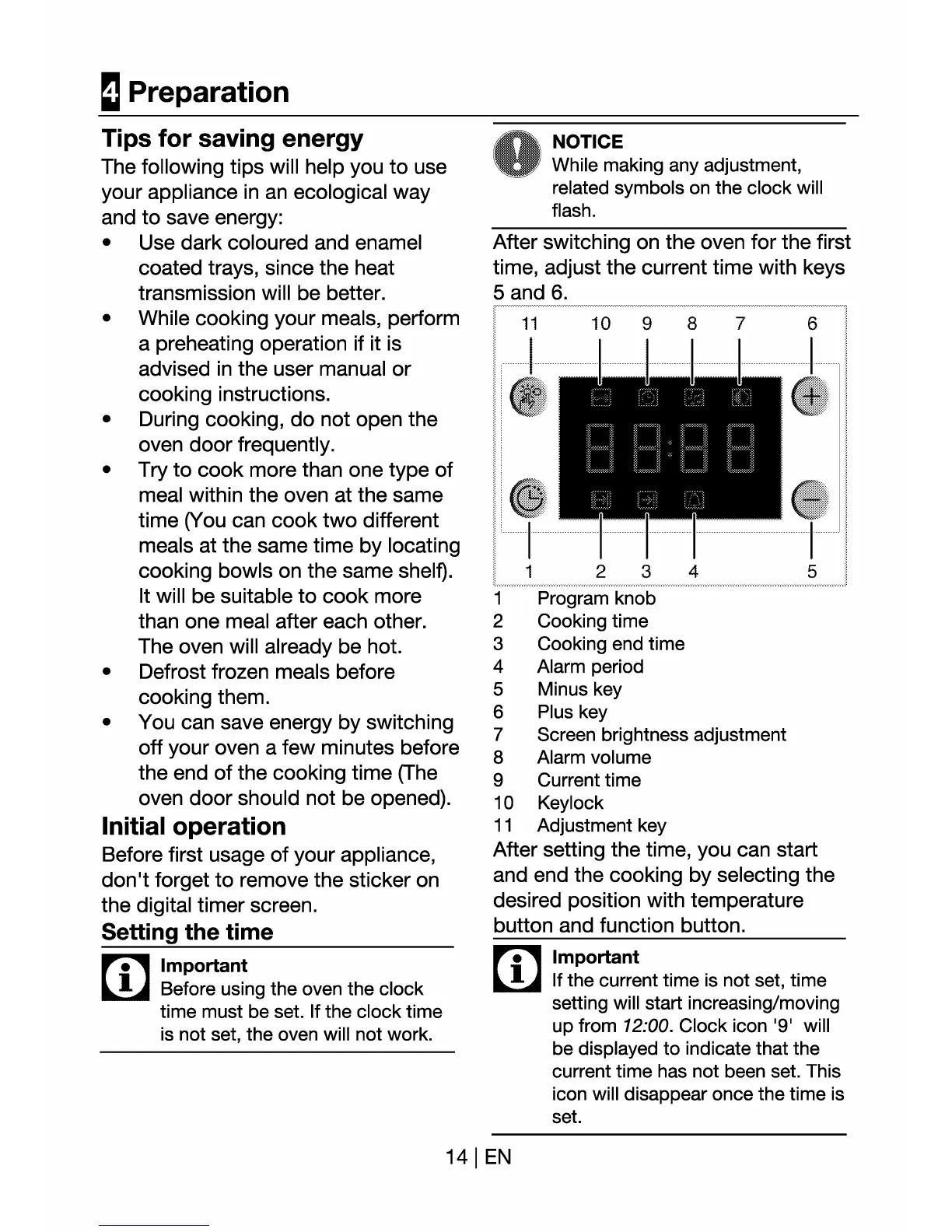 Euromaid MS8 - Preparation and Setup; Energy Saving Tips; Initial Appliance Operation; Setting the Clock Time