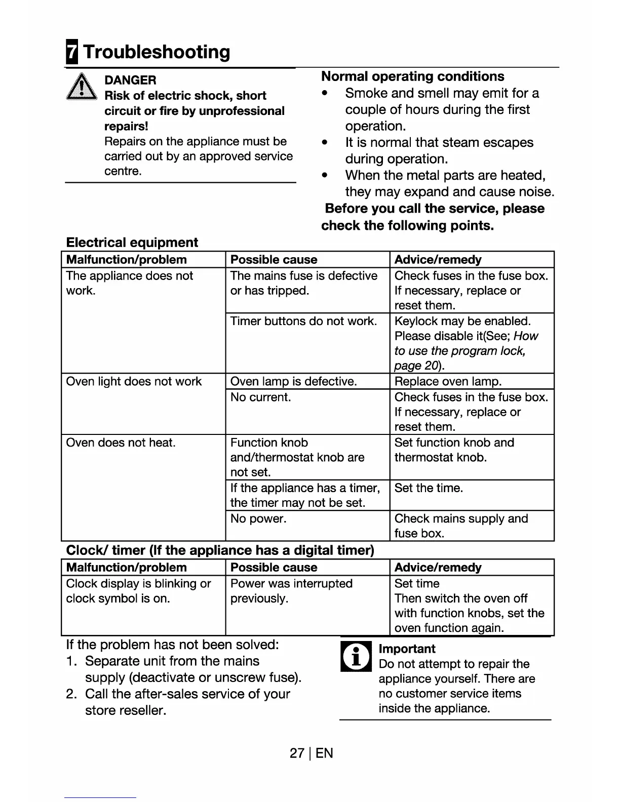 Euromaid MS8 - Troubleshooting Guide; Normal Operating Conditions; Electrical Equipment Issues; Timer and Clock Malfunctions