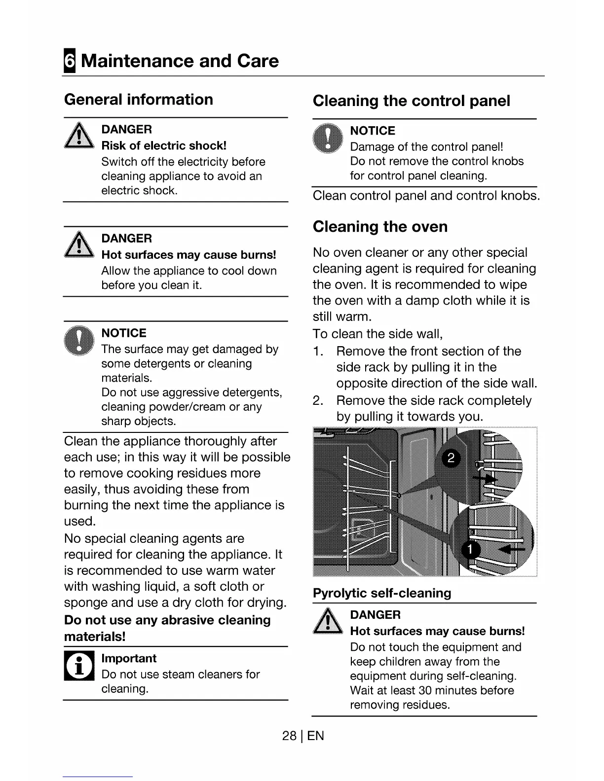 Euromaid PS12 - Maintenance and Care; General Cleaning Safety; Oven and Control Panel Cleaning; Pyrolytic Self-Cleaning