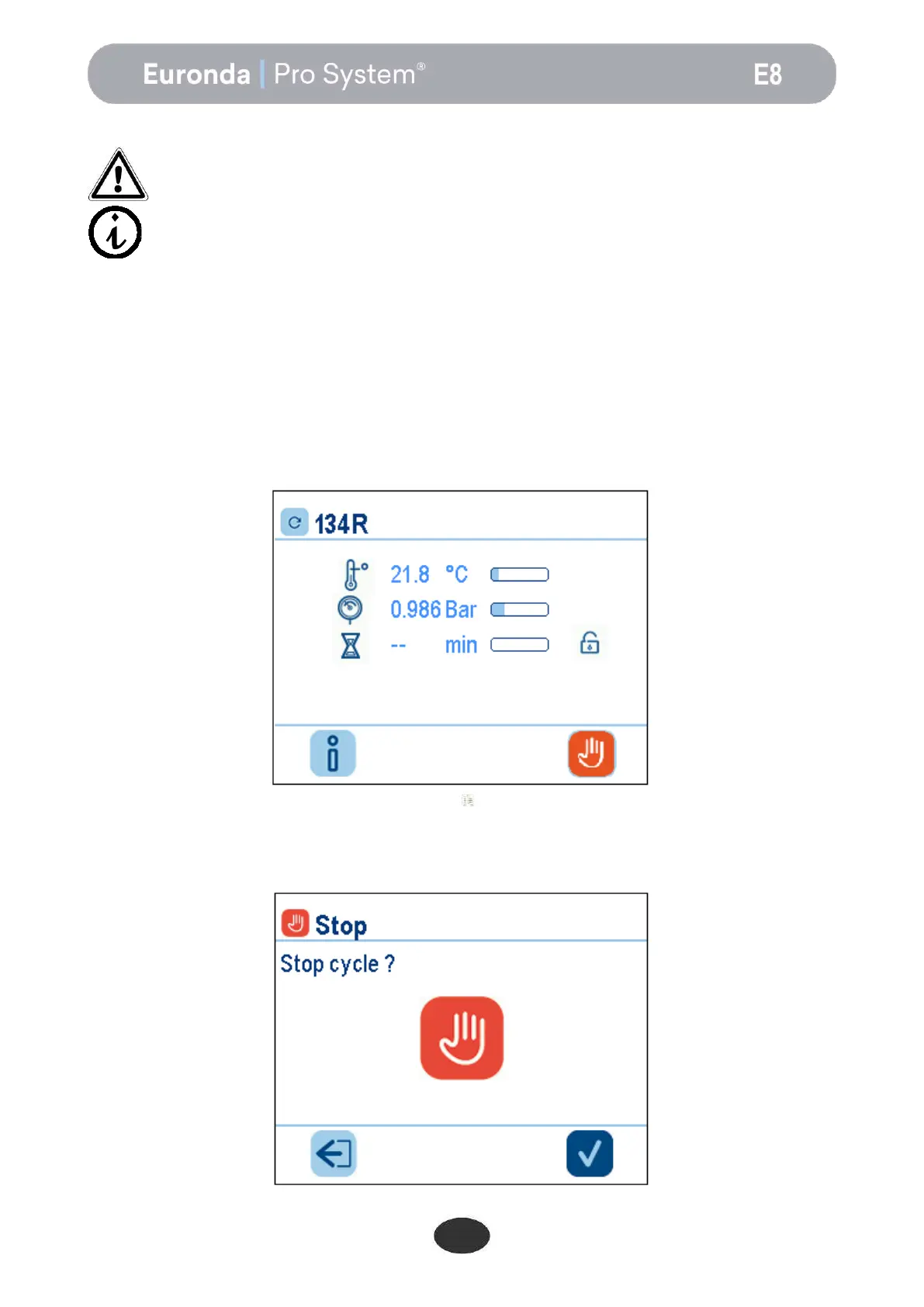 At the bottom, the hand icon for manually stopping the cycle and the “i” icon for accessing the menus giving