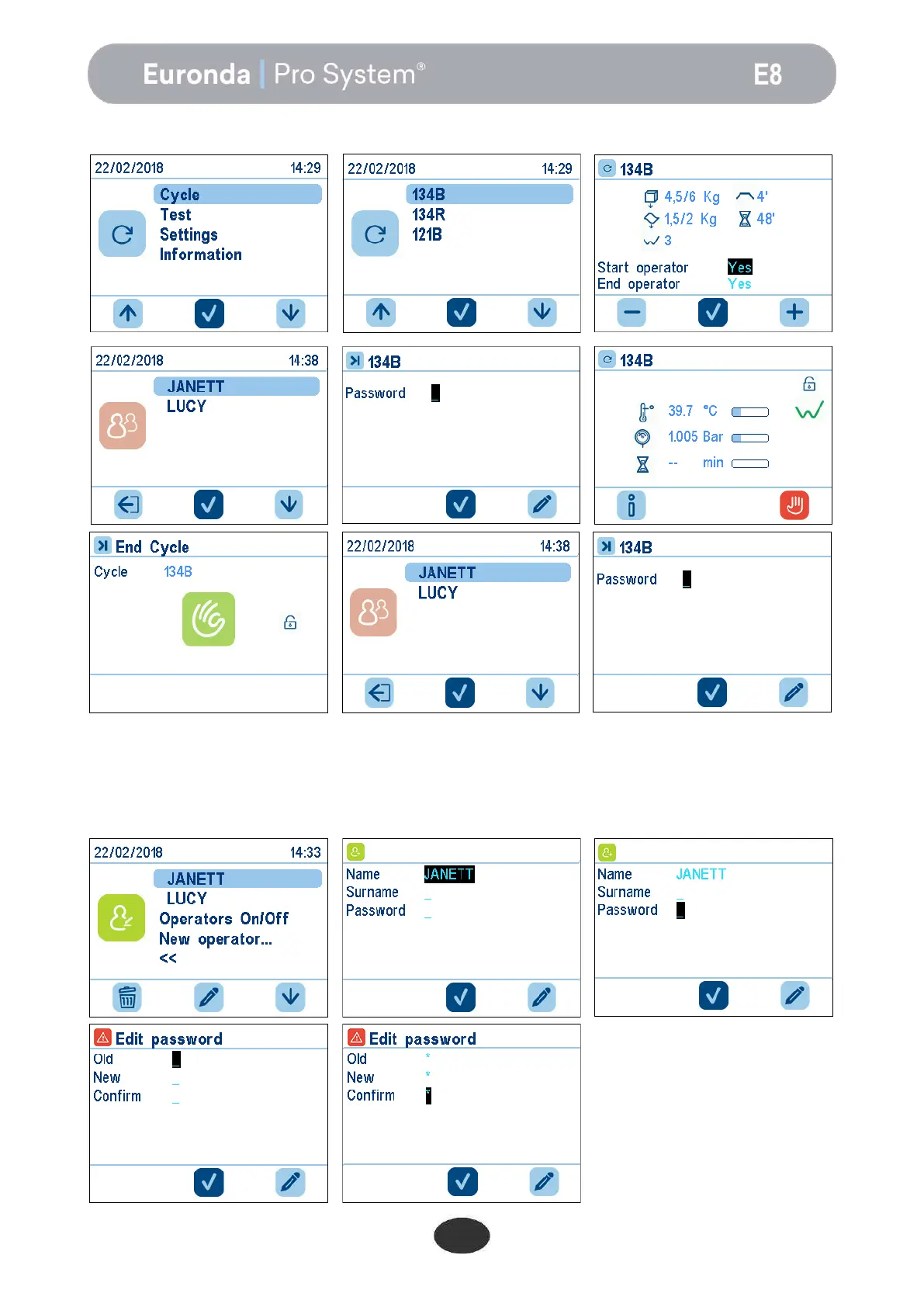 To change the password, enter the Users menu, select the user whose password must be changed, and