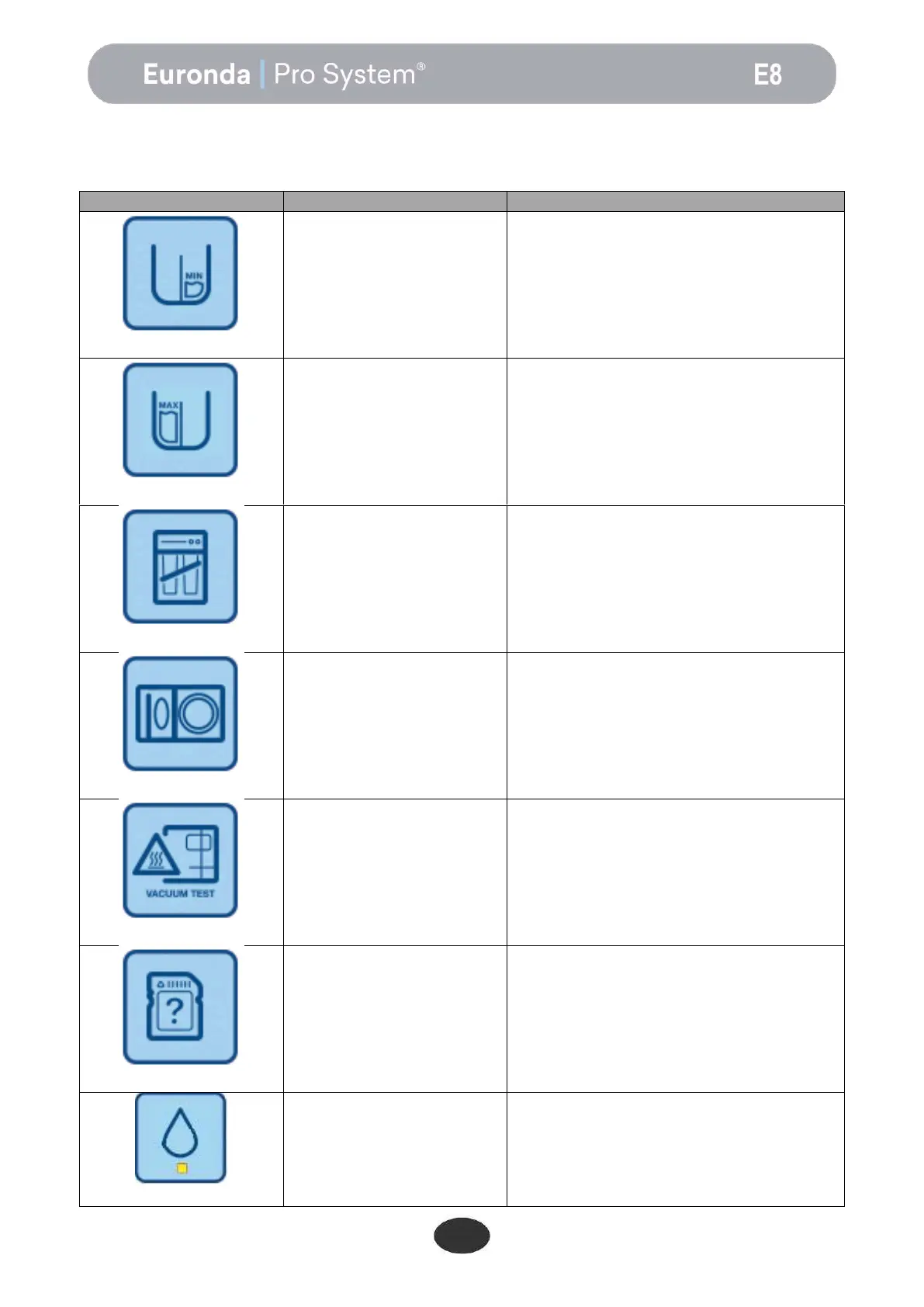 The following table shows the warning messages given by the steriliser using symbols or codes when it