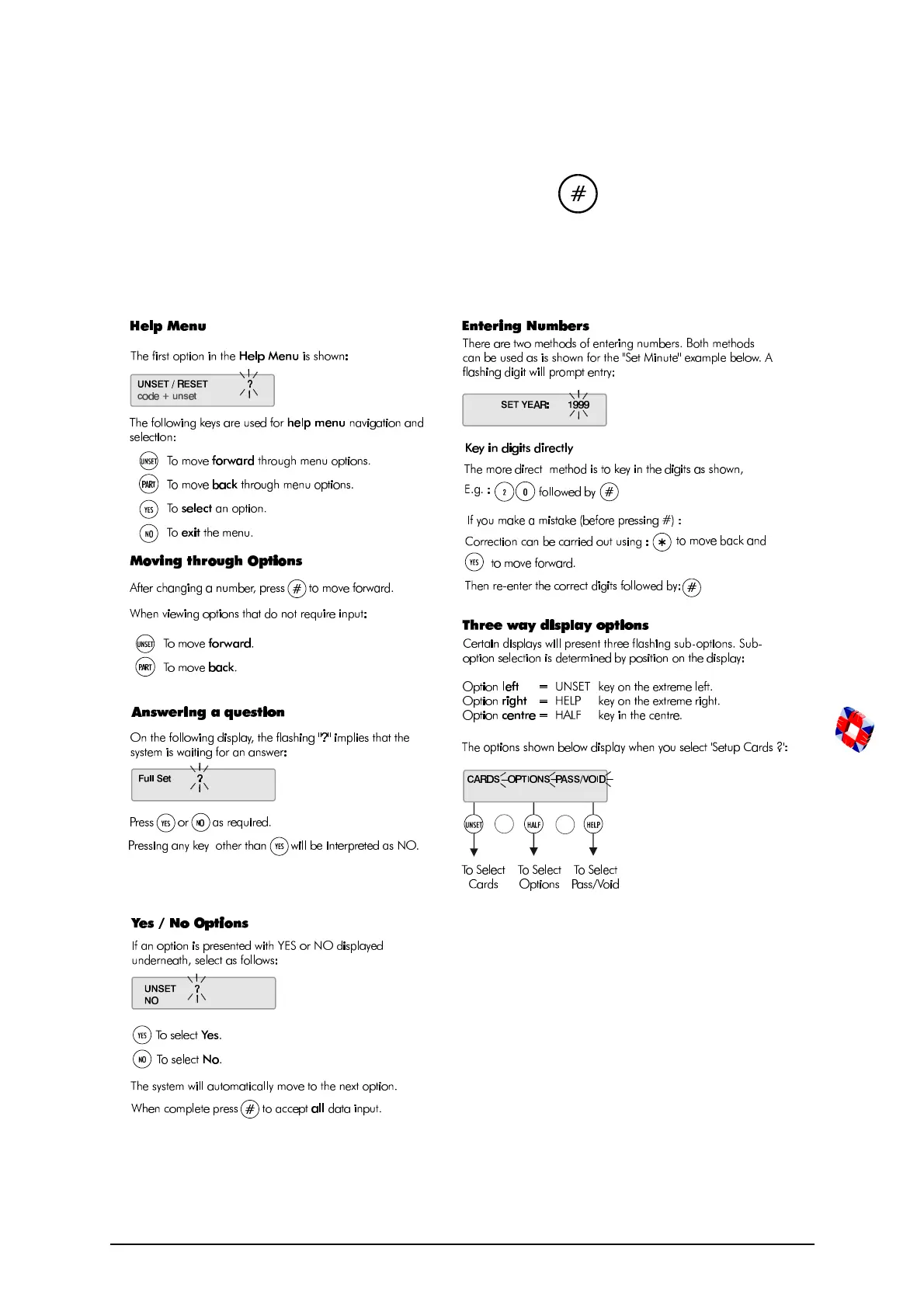 To navigate the Help menu options use the UNSET, PART, YES, NO, keys.