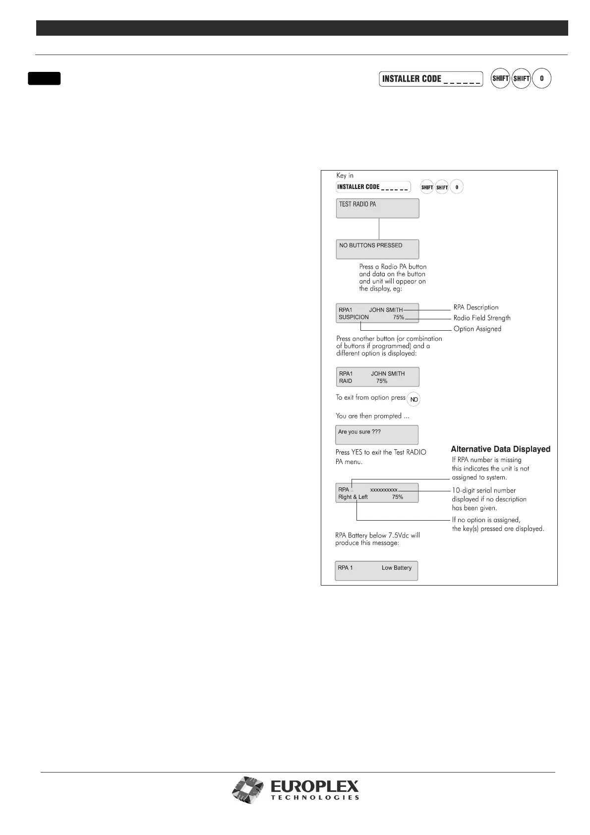 Function: This menu allows you to test radio panic attack buttons on the system, without causing alarms. Details of the unit