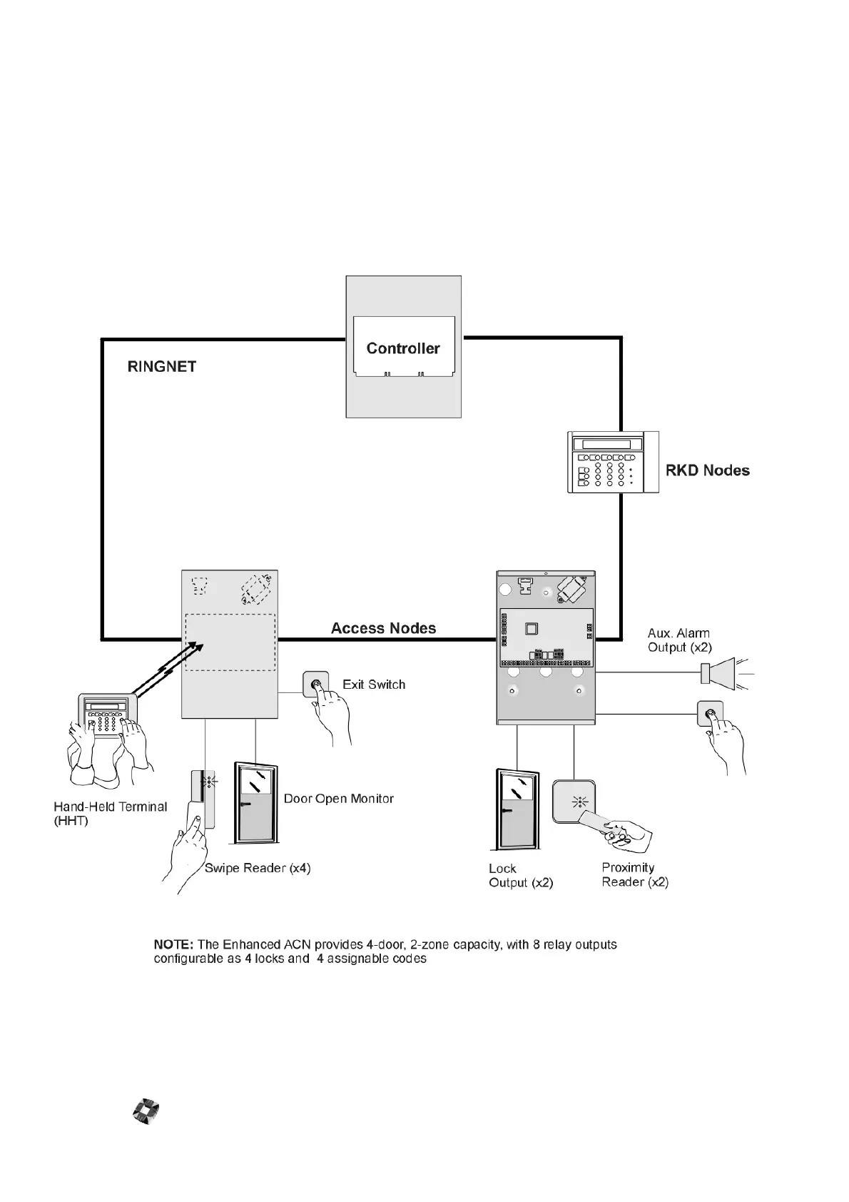 the following diagram. It can be configured to control two access doors (4 doors on the enhanced ACN). These doors