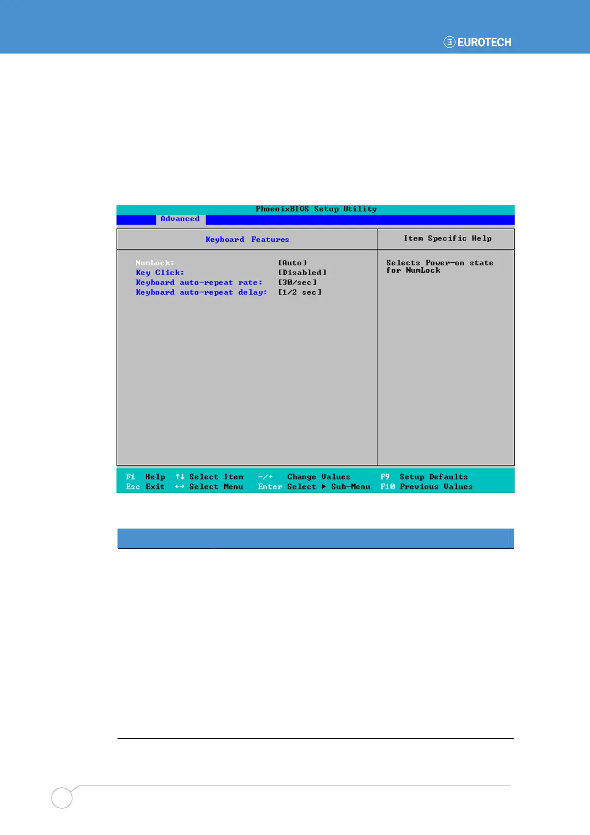 To specify keyboard feature settings, highlight Keyboard Features in the Advanced