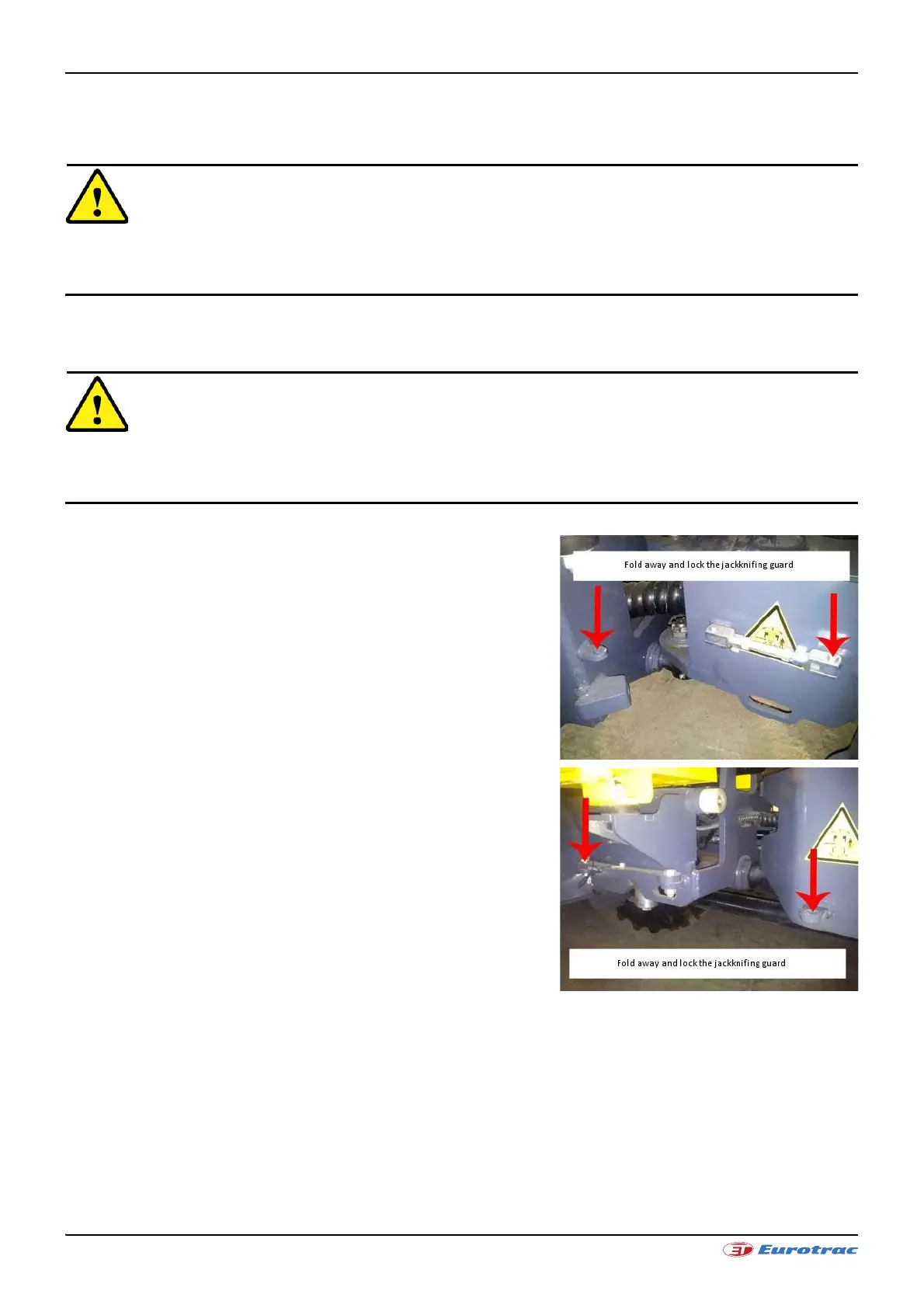 Do not move the steering with the articulated joint blocked. After transportation, first remove the jackknife guard!