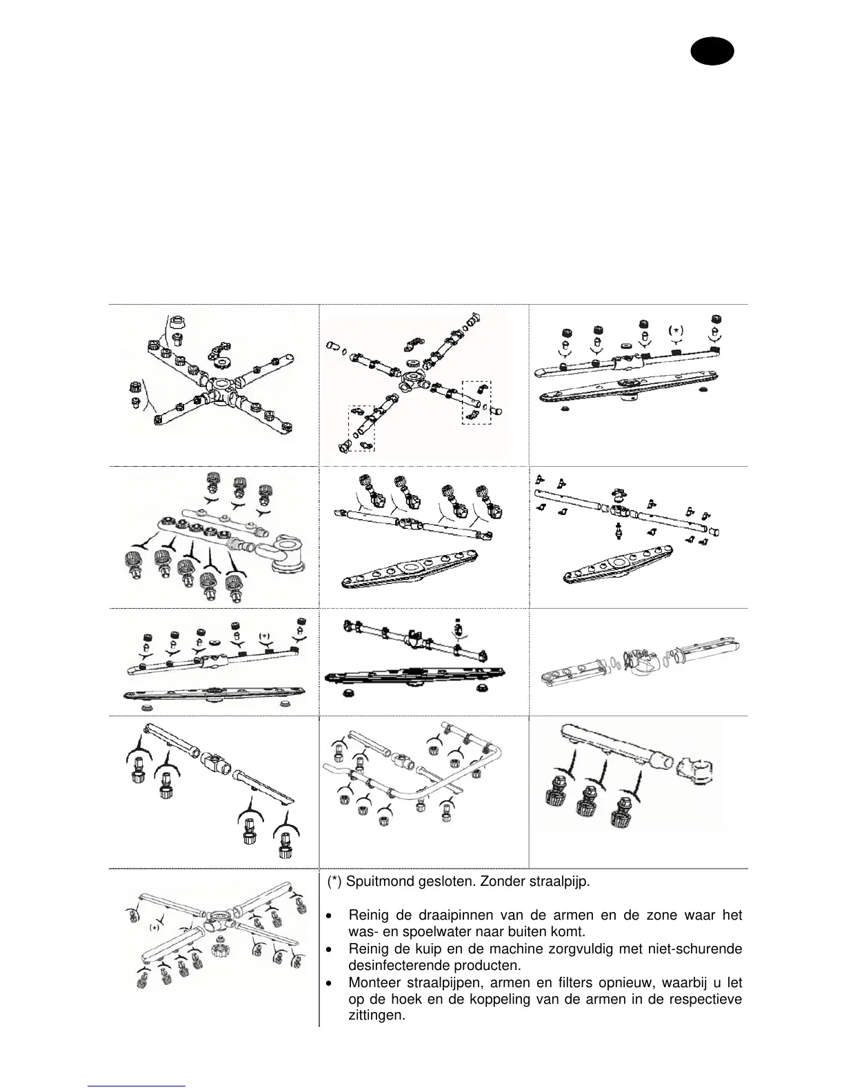 • Verwijder en reinig armen en straalpijpen voor het wassen en spoelen.