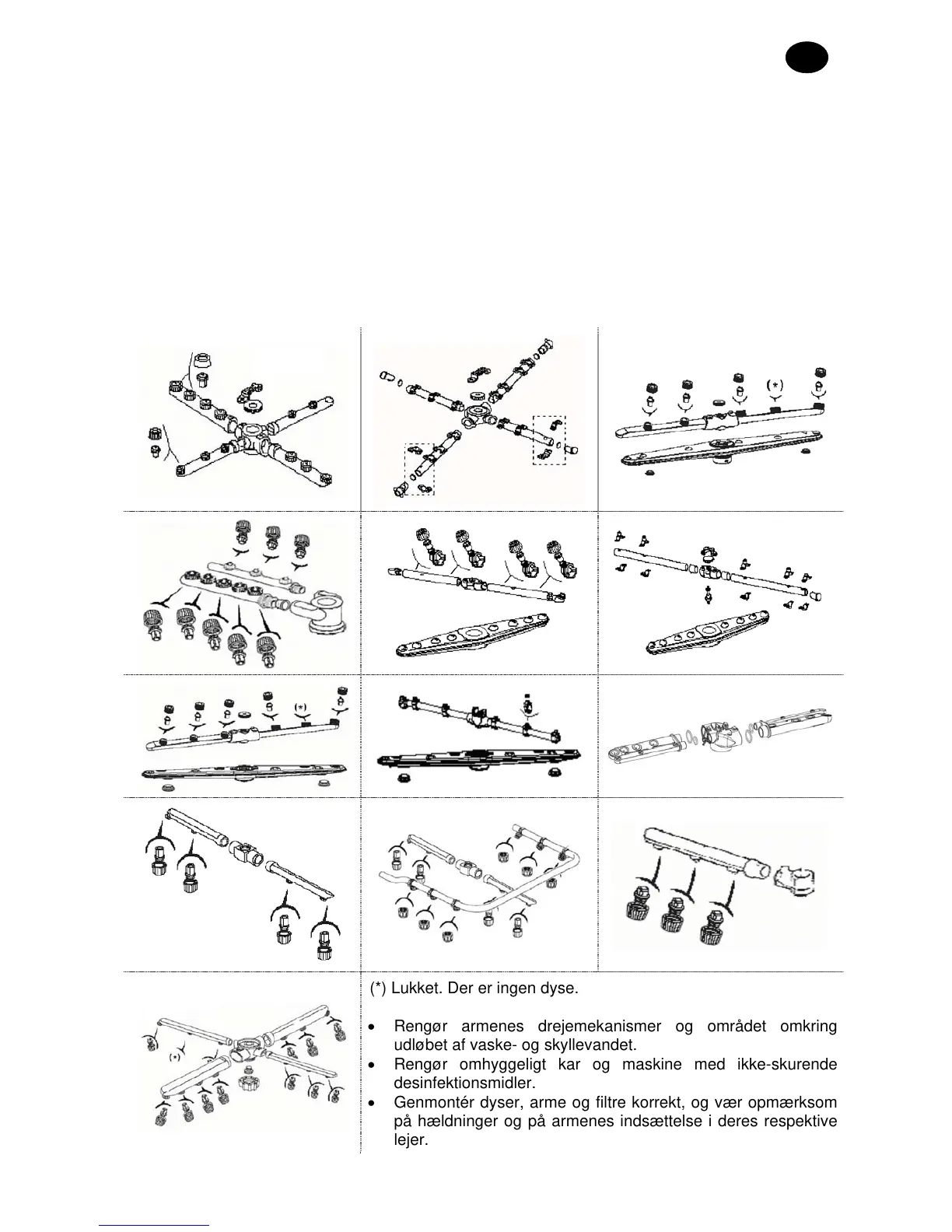 • Fjern og rengør arme og dyser til vask og skyl.