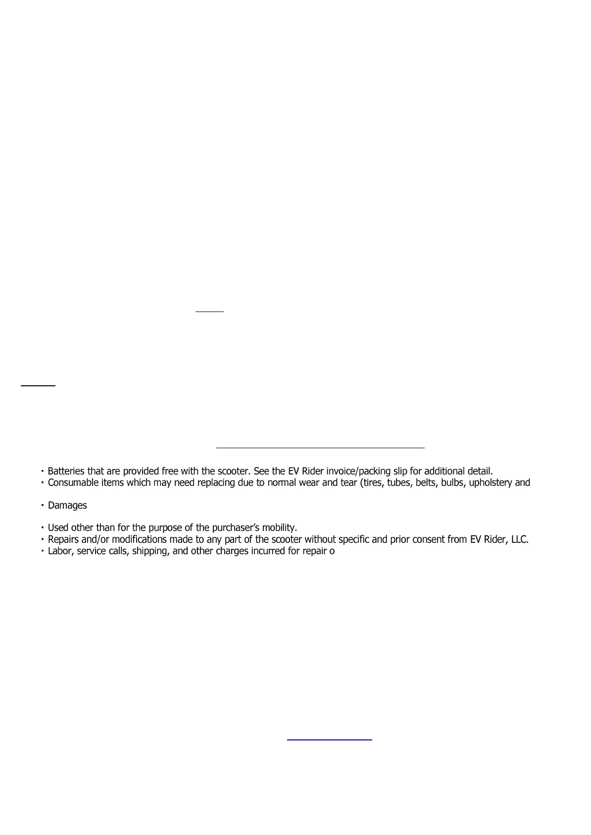 defective in material and/or workmanship, it will be repaired or replaced, at EV Rider, LLC’s option, without charge. Labor