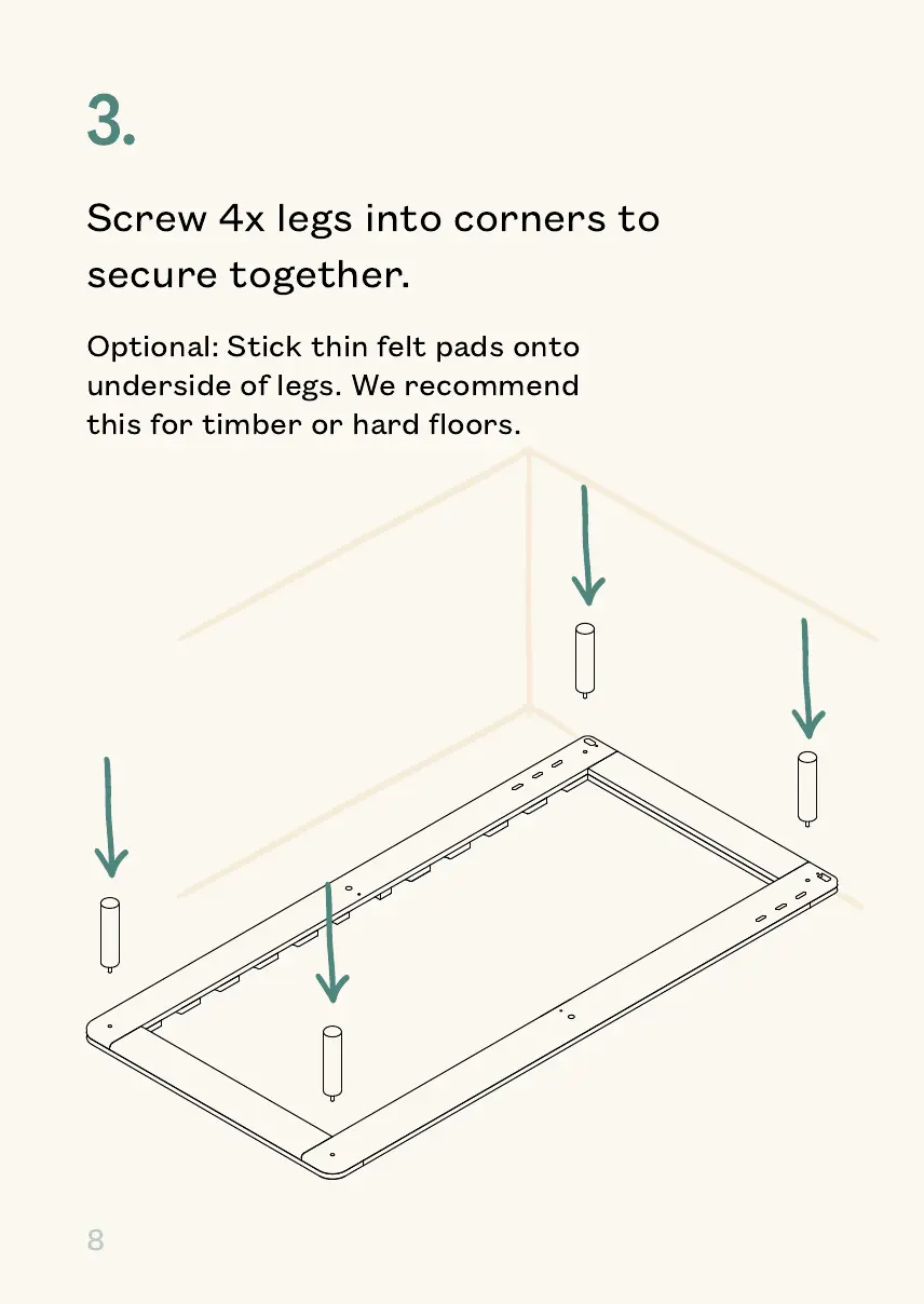 Screw 4x legs into corners to