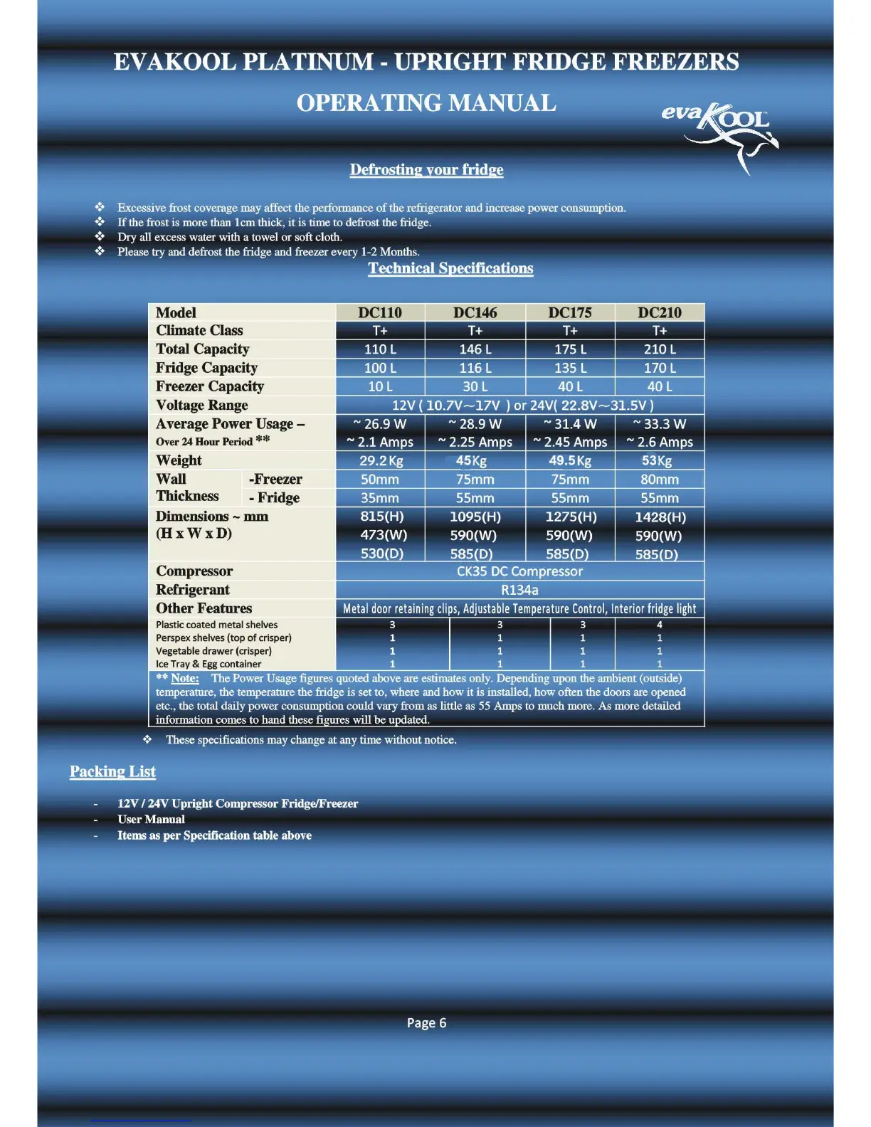 EvaKool DC175 - Defrosting Your Fridge; Technical Specifications; Packing List