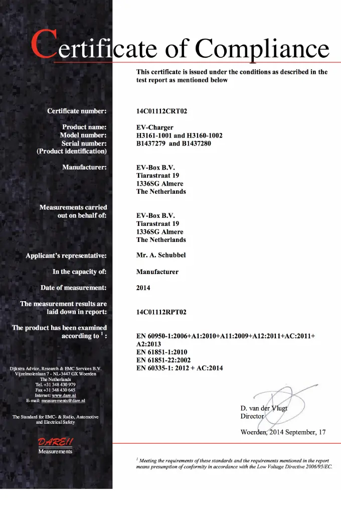 EVBox HomeLine - Certificate of Compliance; Compliance Standards and Test Report