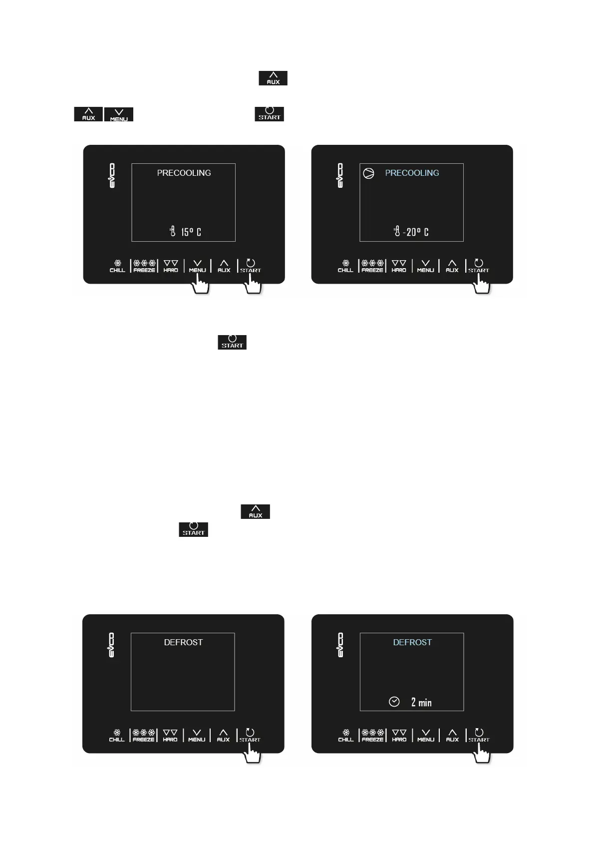 If the evaporator probe is present and the conditions for defrosting are not satisfied, when the START key is pressed,