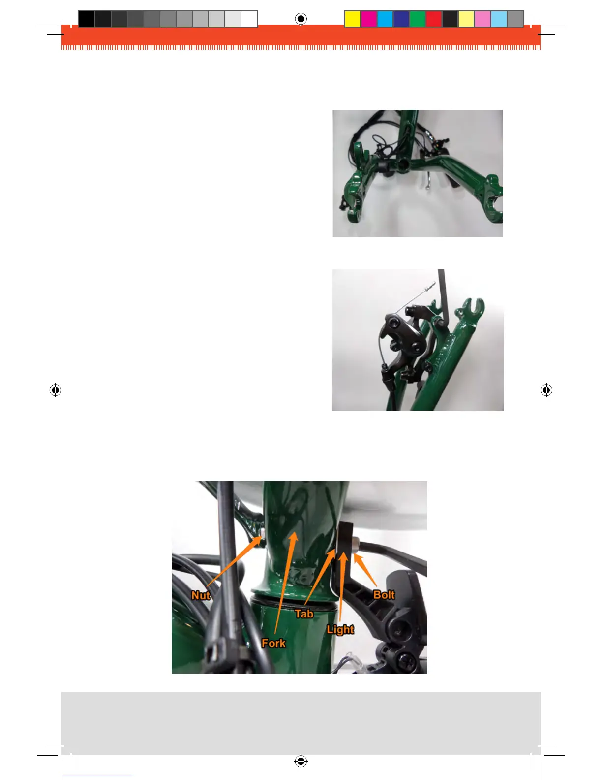 from the front through the headlight bracket, the fender tab, the fork, and install the nut.