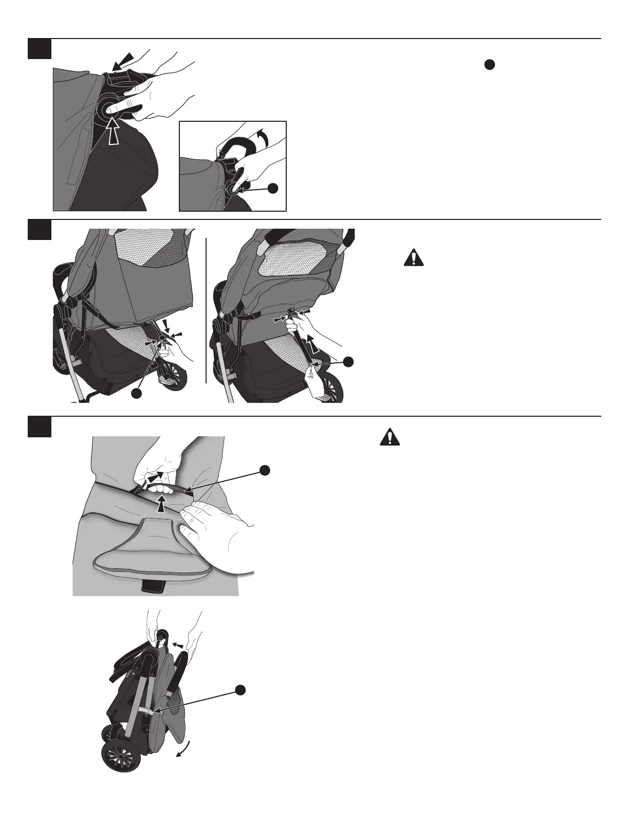 To fold the stroller, lock the rear brakes, close the canopy, and