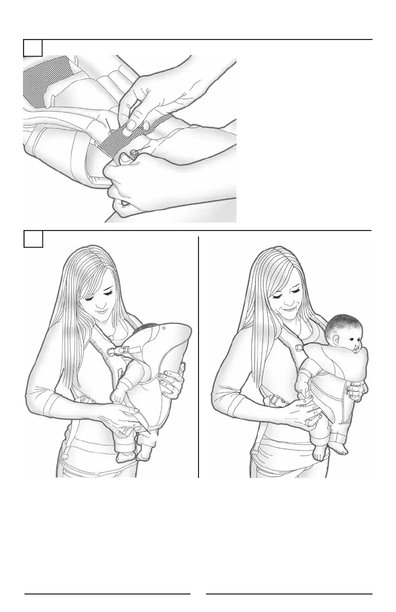 entre la pierna del bebé y la abertura para pierna del portabebés C.