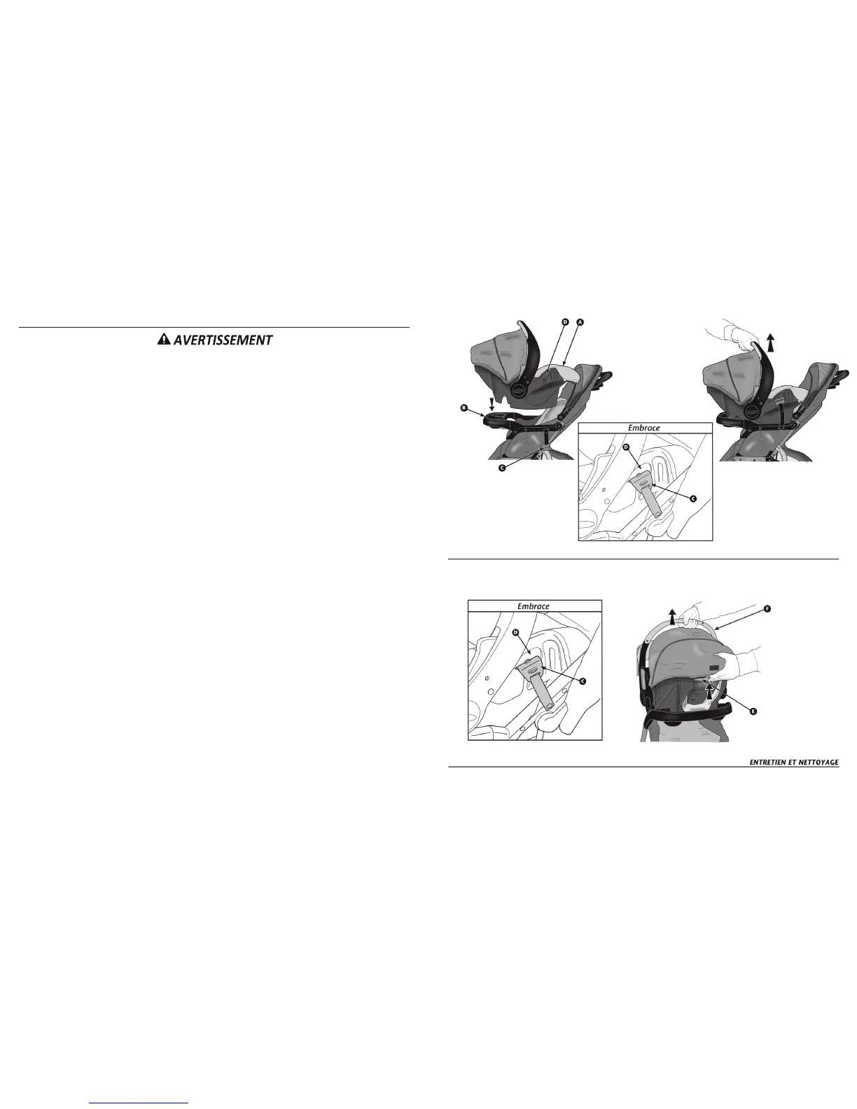 • Afin d’éviter les blessures graves à l’enfant lorsqu’un siège d’auto pour nouveau-né Embrace se trouve dans la
