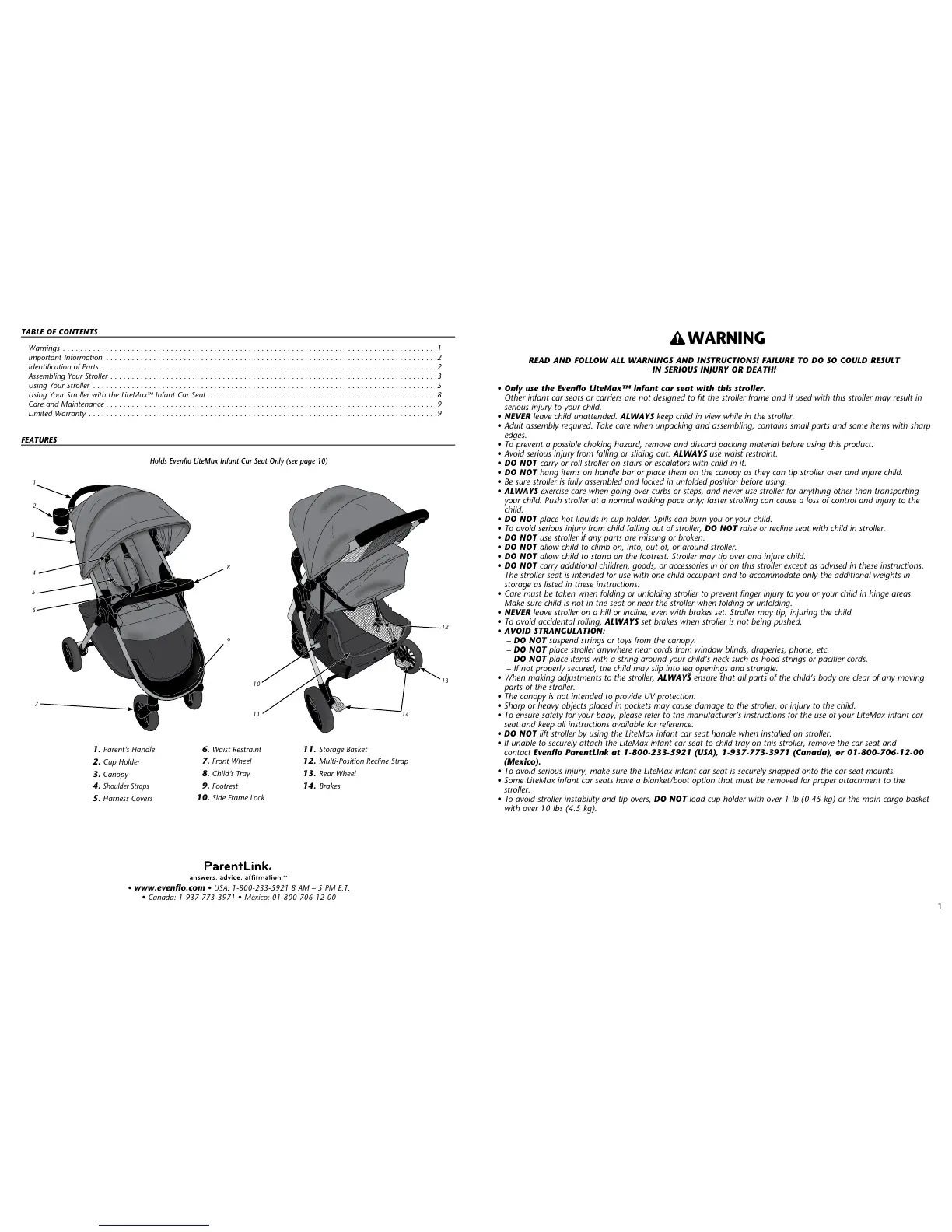 contact Evenflo ParentLink at 1-800-233-5921 (USA), 1-937-773-3971 (Canada), or 01-800-706-12-00