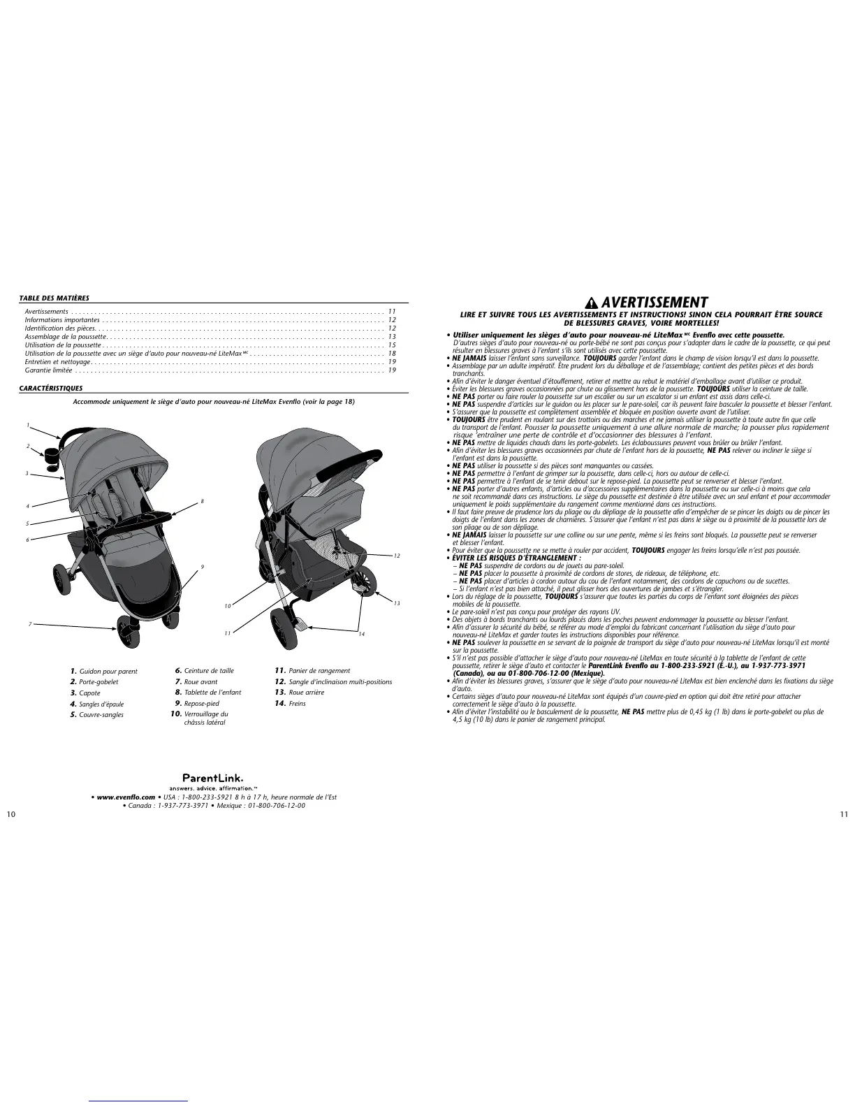 poussette, retirer le siège d’auto et contacter le ParentLink Evenflo au 1-800-233-5921 (É.-U.), au 1-937-773-3971