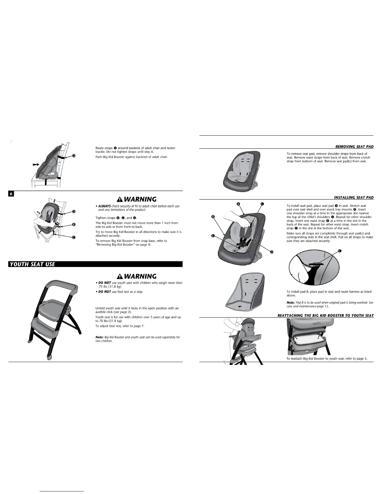 Evenflo Quatore - Youth Seat Use; Removing Seat Pad; Installing Seat Pad; Reattaching the Big Kid Booster to Youth Seat