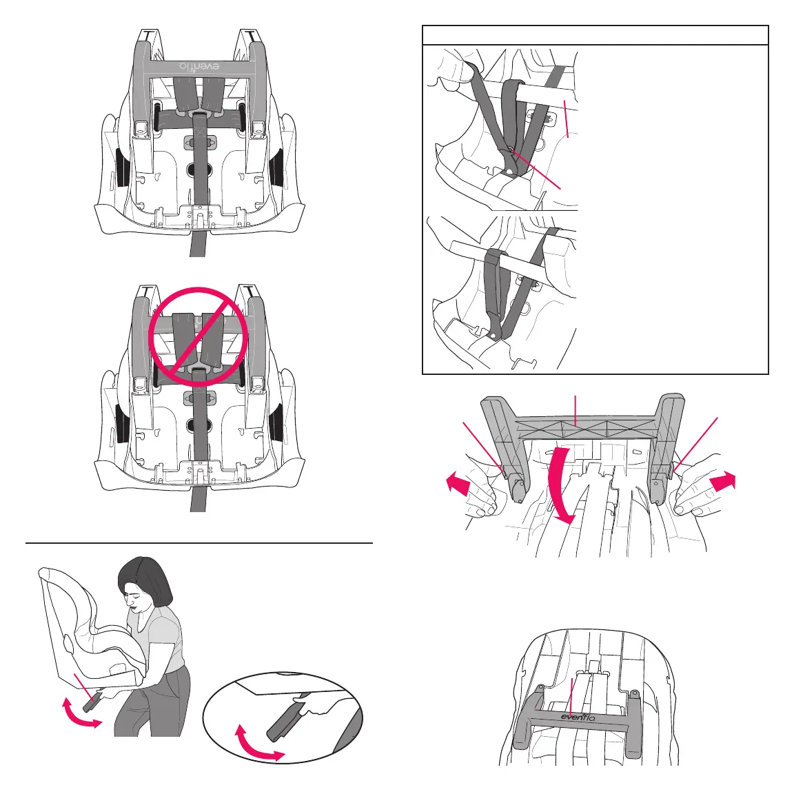 Note: Never route the harness belts over the recline stand.
