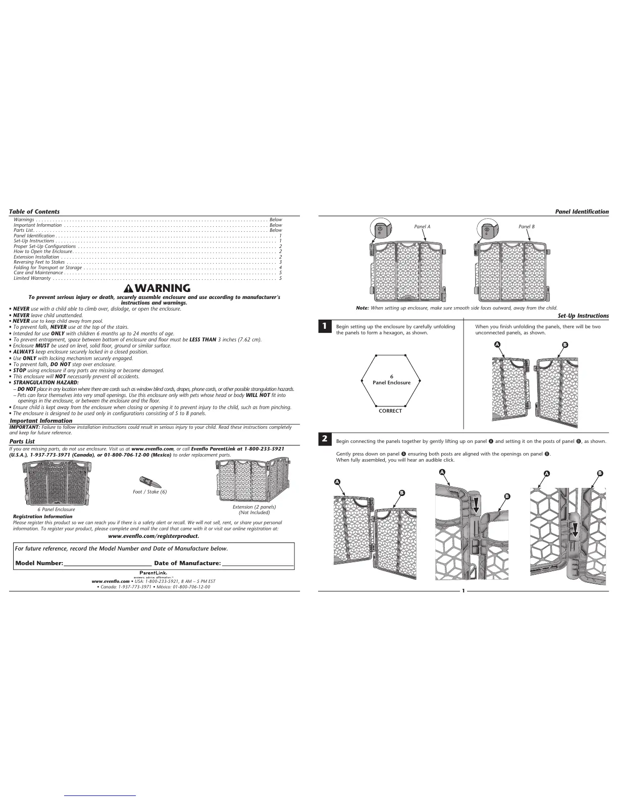 If you are missing parts, do not use enclosure. Visit us at www.evenflo.com, or call Evenflo ParentLink at 1-800-233-5921