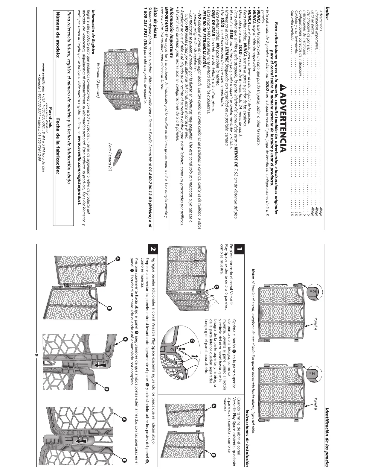 Si faltara alguna pieza, no use el recinto. Visite www.evenflo.com o llame a Evenflo ParentLink al 01-800-706-12-00 (México) o al