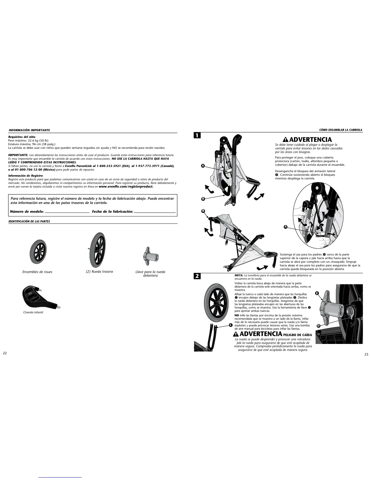 Si faltan partes, no use la carriola y llame a Evenflo ParentLink al 1-800-233-5921 (EUA), al 1-937-773-3971 (Canadá),