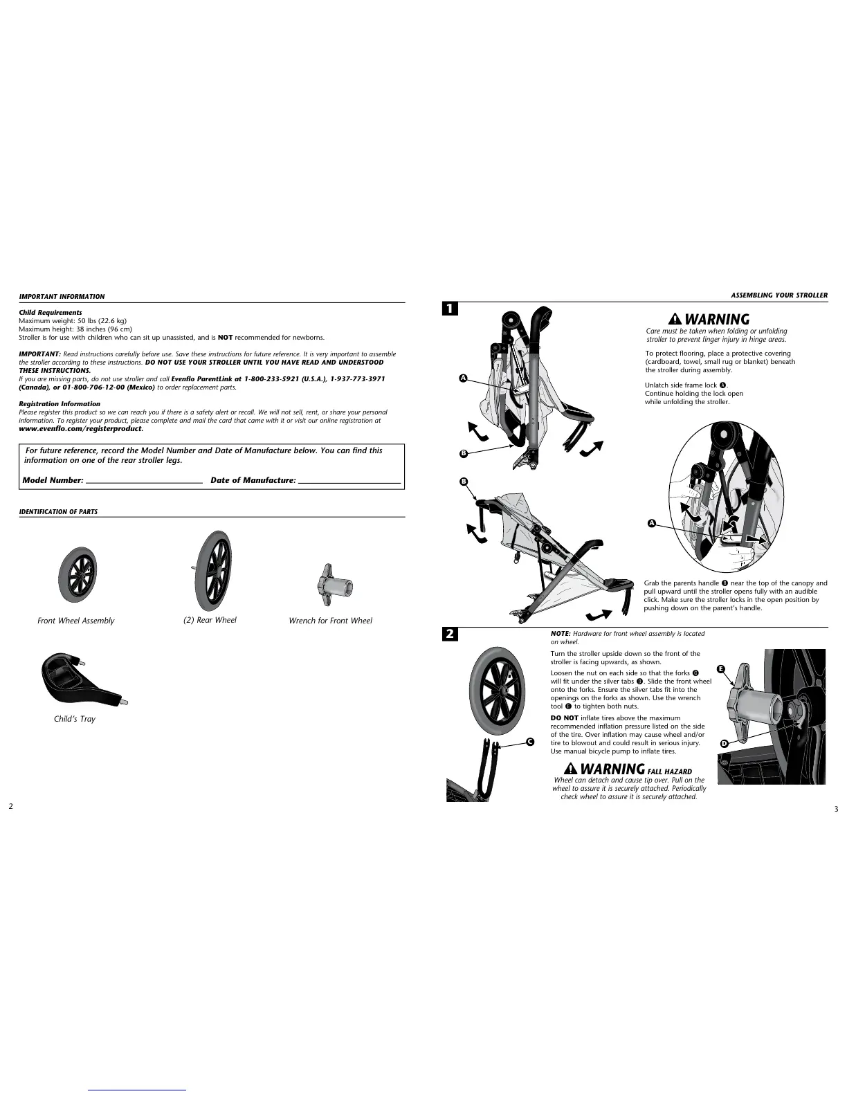 If you are missing parts, do not use stroller and call Evenflo ParentLink at 1-800-233-5921 (U.S.A.), 1-937-773-3971