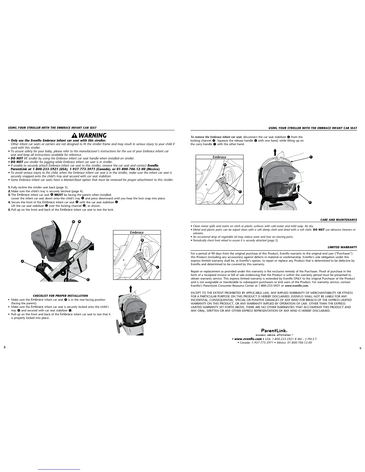 Evenflo’s ParentLink Consumer Resource Center at 1-800-233-5921 or www.evenflo.com.