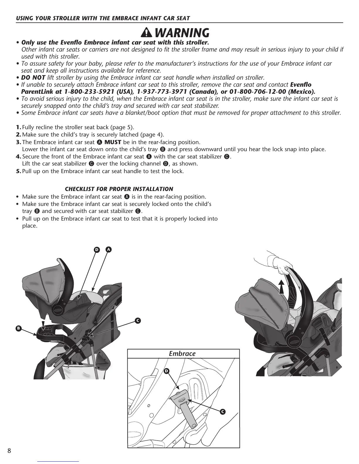 • If unable to securely attach Embrace infant car seat to this stroller, remove the car seat and contact Evenflo