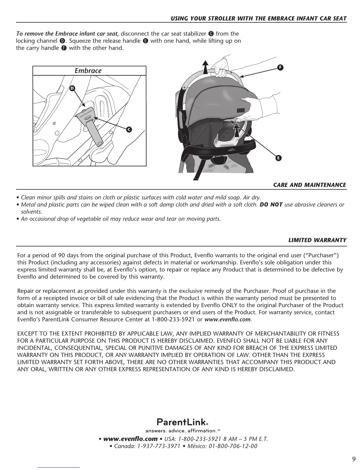 Evenflo’s ParentLink Consumer Resource Center at 1-800-233-5921 or www.evenflo.com.