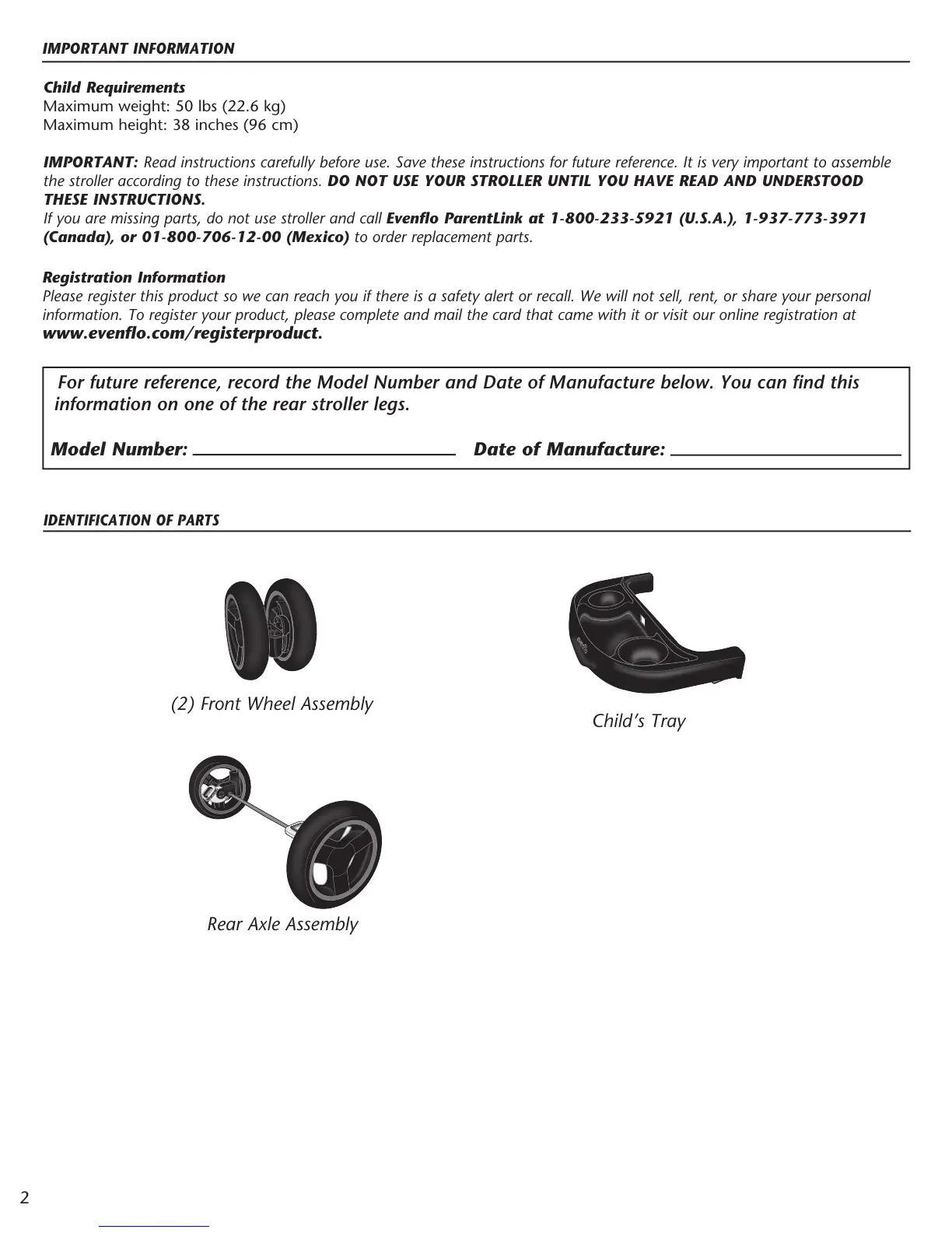 If you are missing parts, do not use stroller and call Evenflo ParentLink at 1-800-233-5921 (U.S.A.), 1-937-773-3971